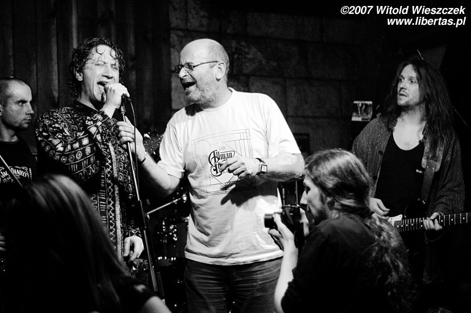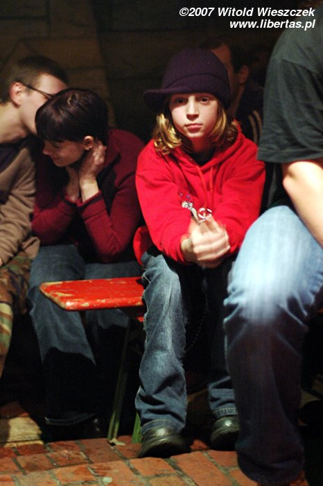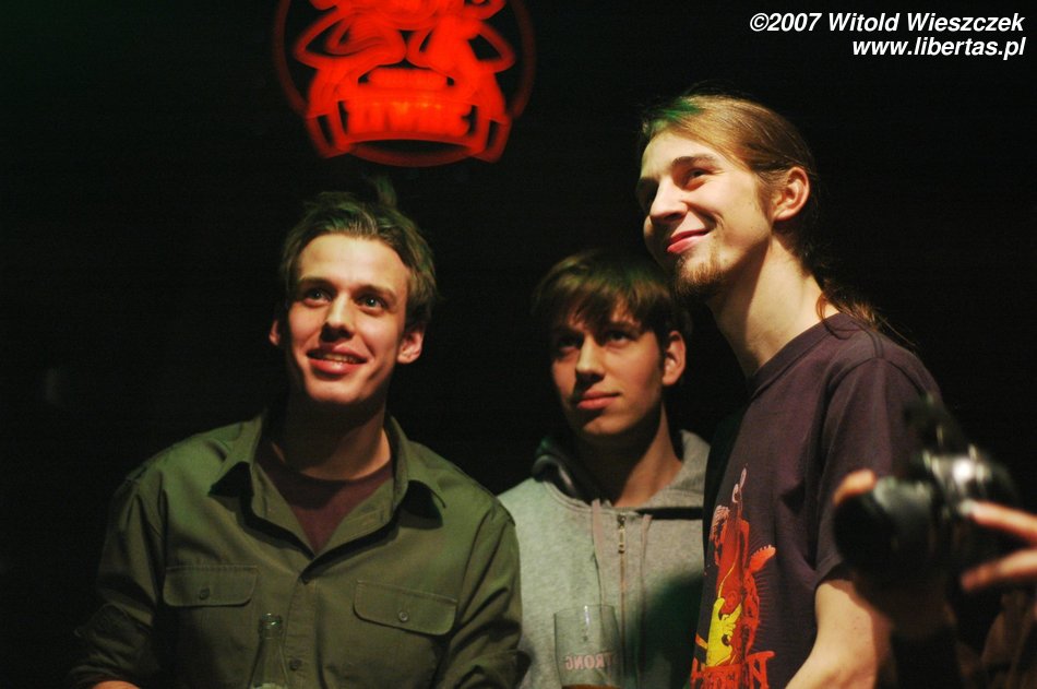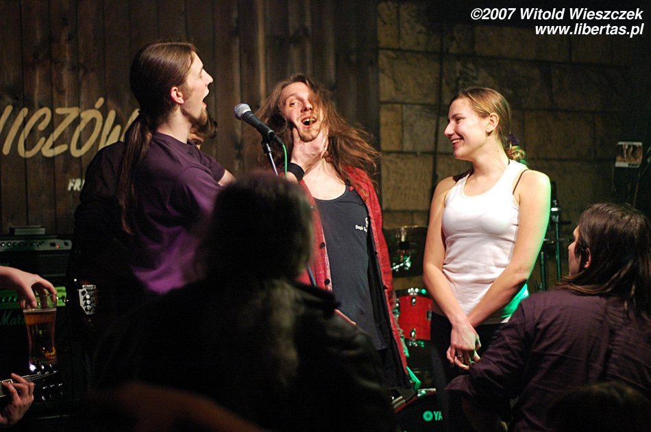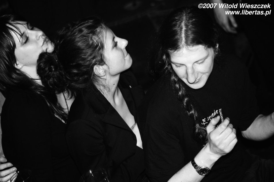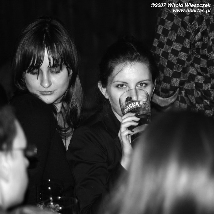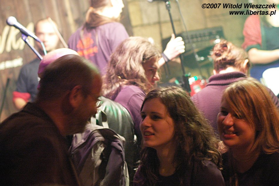 Pod koniec miałem okazję wychylić z Osłami lufę żołądkowej, podziękować Jasiowi za wspaniały koncert i poznać Mariusza Korczyńskiego (którego wokal zrobił na mnie równie wielkie wrażenie, jak skrzypki Janka) oraz Maxa (który palił papierosa, zagryzał go chlebem ze smalcem i wybijał pałeczkami rytm na krześle)! Nie mniejszą przyjemnością było poznanie przesympatycznych dziewczyn (chyba przyprowadzonych przez Piotrka): Basi, która miała fajny nie tylko biust i Martynki, w której rozbrajającym uśmiechu oczywiście od razu się zakochałem!