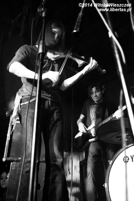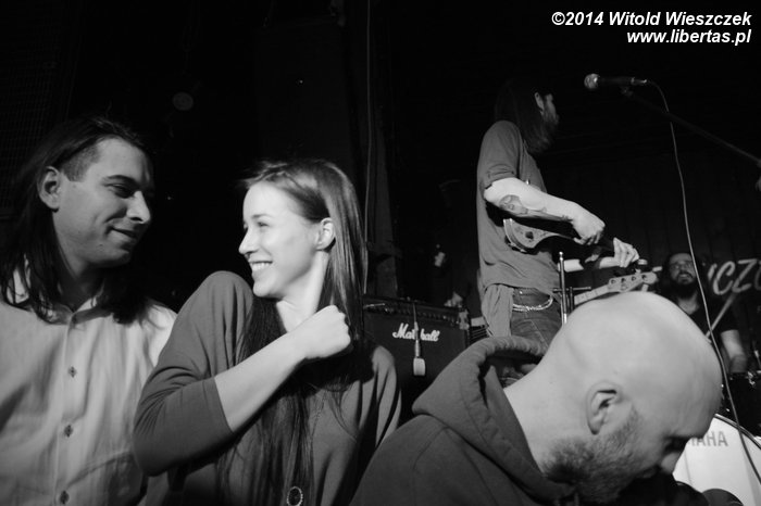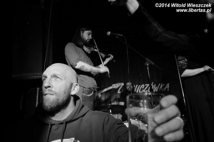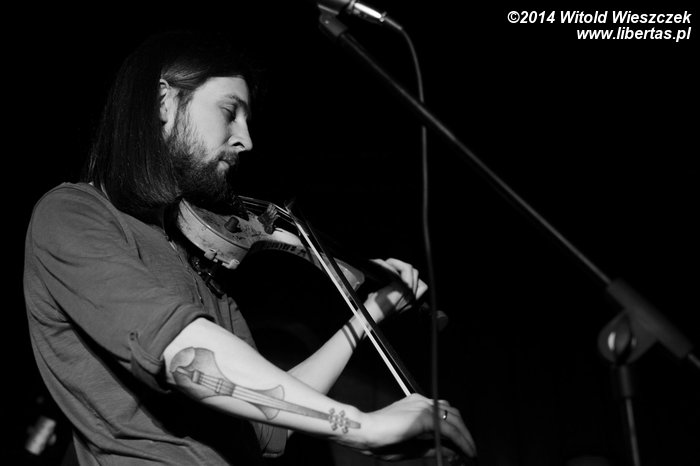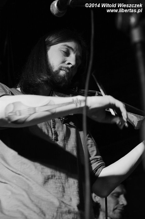 Ciasno jest niemożebnie, przyklejam się więc na wszelki wypadek do głośnika – zawsze to jakiś punkt oparcia – i lustruję scenę w poszukiwaniu znajomych twarzy. Janek jak zwykle dzierży te swoje magiczne skrzipki i czaruje tak, że już od pierwszych dźwięków stoję jak zahipnotyzowany. Zaraz zaraz, ale co on ma na ręce? Kilka lat temu Karolina wymalowała chłopakom na twarzach barwy wojenne, ale tym razem to chyba nie jej dzieło. Jeśli oczy mnie nie mylą, to Jasiu wytatuował sobie swój ulubiony instrument! Jednym słowem, już zawsze będzie miał skrzypce pod ręką!