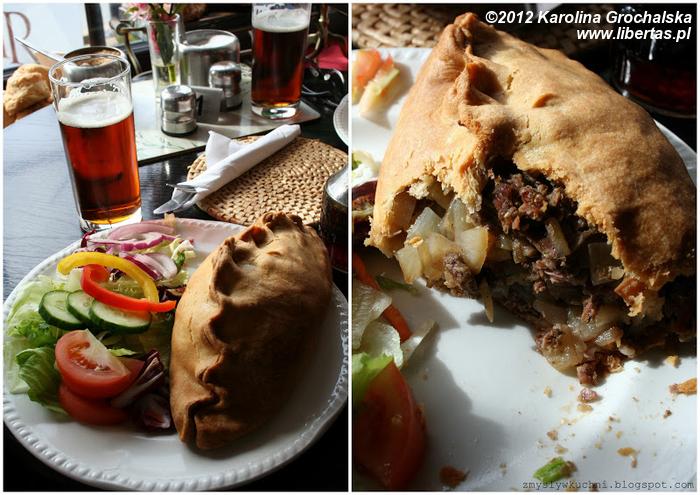 W Tintagel mieliśmy okazję jeść fantastyczne lokalne pieczone pierogi, które tradycyjnie nadziewane są wołowiną, cebulą, brukwią i ziemniakami – Cornish Pasty, i jeśli będziecie w Kornwalii, to szukajcie sklepów i kafejek oferujących Pengenna Pasties (są w czterech miejscach regionu) – ciasto było idealnie kruche, nadzienie bogate, aromatyczne i bardzo smaczne. Nigdzie nigdy nie jadłam tak pysznych Cornish pasties, a próbowałam już kilku. Według ortodoksów prawdziwe Cornish pasties powinny mieć lepiony brzeg na boku, a nie u góry, więc chyba to nasze nie było ortodoksyjne, ale pyszne! W ofercie są też pierogi z innym nadzieniem, także wegańskie. Początkowo pierogi te były bezmięsne i były typowym jedzeniem ubogich ludzi, którzy często wychodzili do pracy w kopalniach czy na farmach. Poręczny kształt, odżywcze walory powodowały, że było to idealne jedzenie do zabrania z domu i do zjedzenia w każdym momencie. Podobno górnicy odgrzewali pierogi w piecach, w których topiło się wydobywane metale i ciasto pozwalało zminimalizować kontakt nadzienia ze szkodliwymi składnikami (np. arszenikiem); nadzienie samo w sobie jest pożywne.