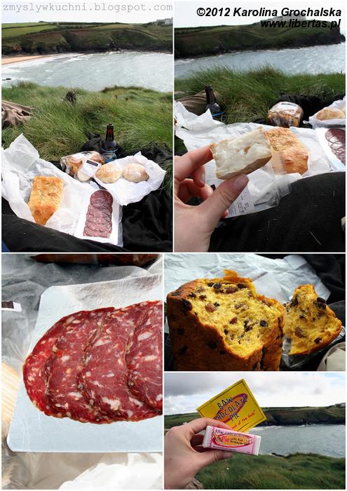 Na festiwalu zrobiliśmy małe zakupy i pojechaliśmy na południowe wybrzeże w poszukiwaniu jakiegoś miejsca, w którym moglibyśmy zaimprowizować piknik. Apetyt duży, widoki piękne, a do jedzenia mieliśmy genialne salami z jelenia (z Deli Farm Charcuterie), focaccię z rozmarynem, małe ciabatty, wędzony pleśniowy kozi ser Tesyn, tradycyjne ciasto szafranowe z suszonymi owocami, lokalne piwa (ale z browaru Penpont), a także świetny surowy (witariański, raw) czekoladowy paj z różową solą himalajską (z Raw Choc Pie). Przy okazji wspominania tego festiwalu napomknę tylko, że Kornwalia jest domem dla wielu producentów serów, najbardziej znane to: Davidstow Cheddar, Cornish Yarg, czy mój ulubiony Cornish Blue. Na festiwalu kupiliśmy też pastę z tego ostatniego z figami – niebo w gębie. Druga wersja była z gruszkami i orzechami włoskimi, równie dobra, degustowaliśmy.
