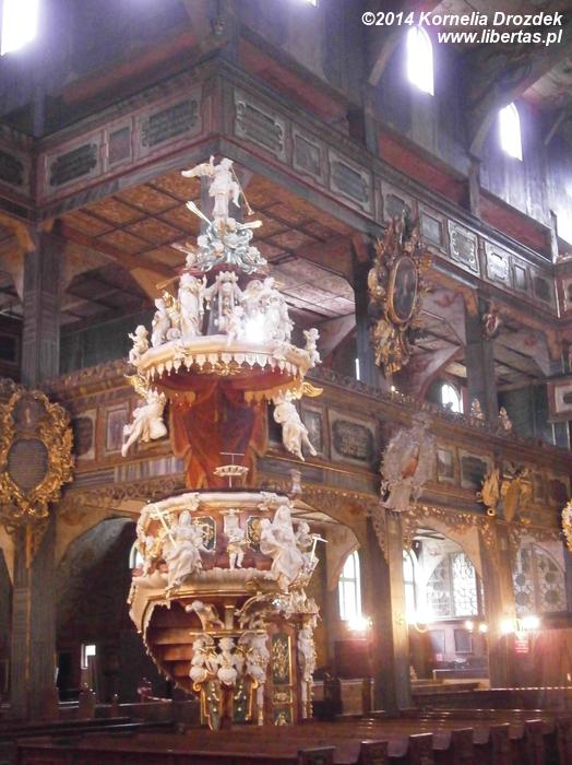 Początkowo bardzo skromne i surowe wnętrze odpowiadało postulatom ikonoklazmu protestanckiego, negującego wszelkie przedstawienia religijne. Ze względu na charakter nabożeństwa ewangelickiego, którego nieodłączną częścią jest śpiew chorałów zgromadzonego ludu, najpilniejszą potrzebą stało się zamówienie dla świątyni organów. Firma Gottfryda Klosa w Brzegu wykonała imponujące, barokowe organy, które do dzisiaj przeszły wiele konserwacji i przebudów. W kościele znajdują się również drugie organy, których używano, gdy tamte były nieczynne. Stoją one we wschodniej części kościoła nad ołtarzem, na najwyższej trzeciej emporze. Pojawienie się organów było impulsem do dalszych prac we wnętrzu kościoła. Wykonanie polichromii powierzono lokalnemu artyście Krystianowi Sussenbachowi, do którego później dołączył się Krystian Kolicki. Malowidła wykonane farbami olejnymi pokryły cały strop oraz opasające wnętrze kościoła empory. Prace trwały około trzech lat, a ich koniec miał miejsce w 1696 roku. Ponieważ cały strop konstrukcyjny dzieli się na pięć części, pokryty został pięcioma wielkimi kompozycjami. Każda z nich została zamknięta w ośmiobocznym obramowaniu.