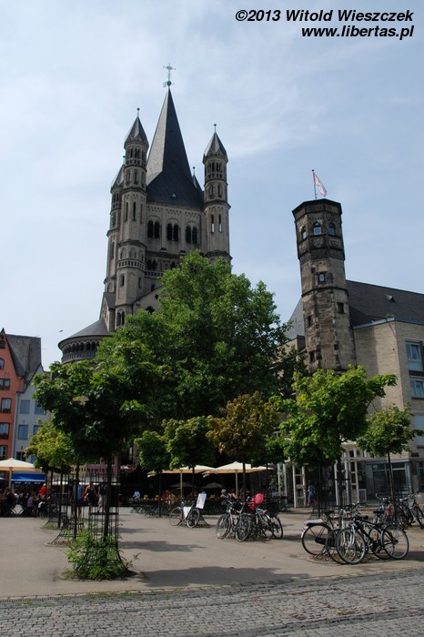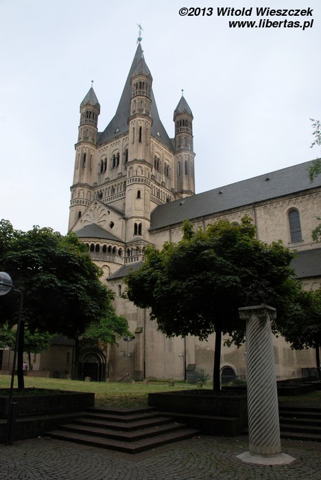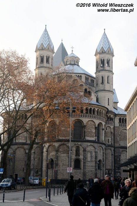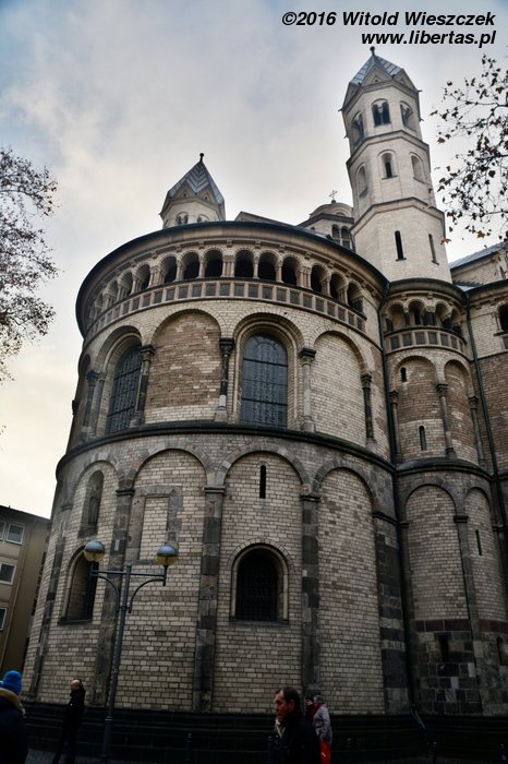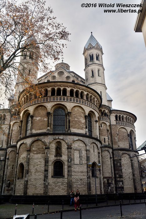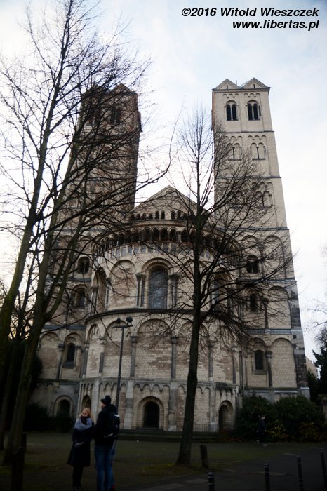 Kościół Świętego Marcina jest trójnawową orientowaną romańską bazyliką na planie koniczyny. Nad prezbiterium otoczonym apsydami wznosi się wysoka i masywna wieża. Kiedy podziwiam panoramę Kolonii z drugiej strony Renu, to właśnie charakterystyczna wieża kościoła Świętego Marcina wraz z gotyckimi wieżami Katedry najbardziej przykuwają moją uwagę.
