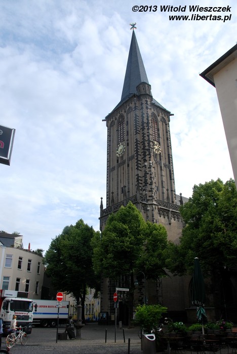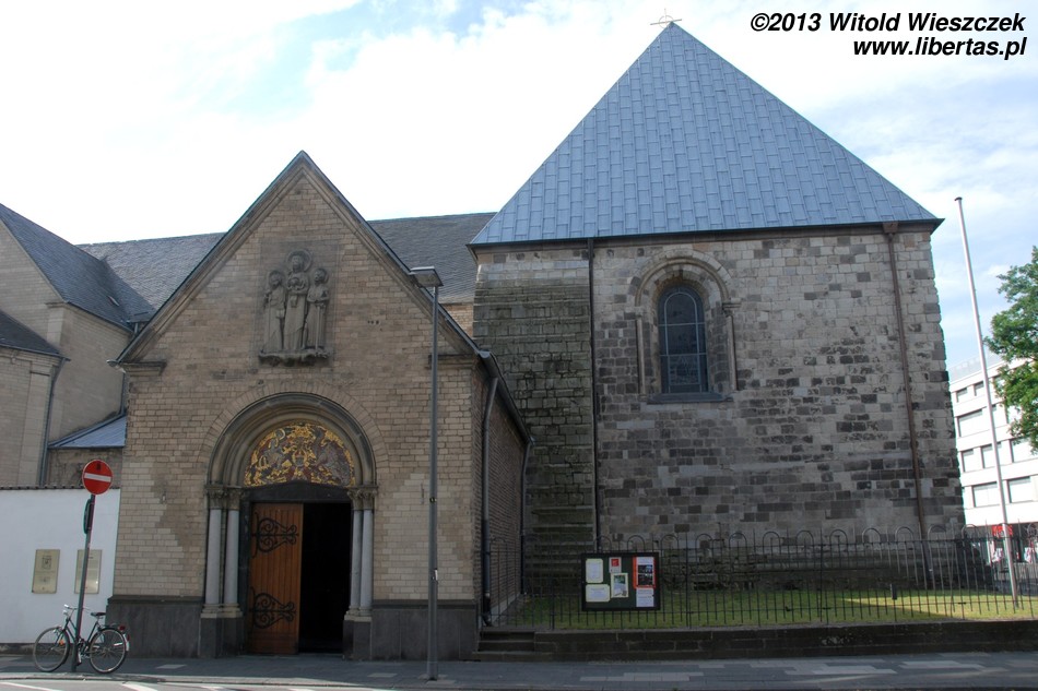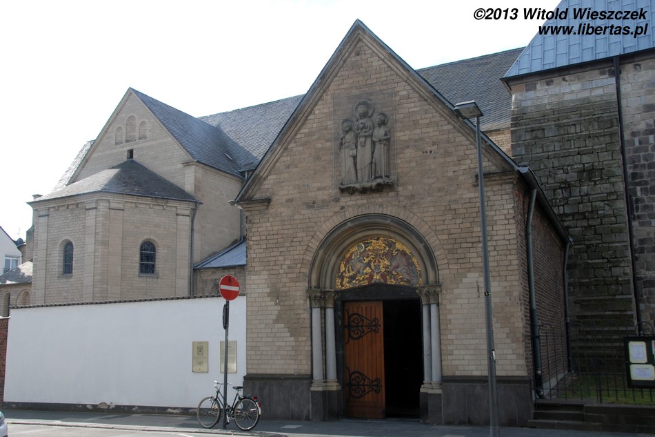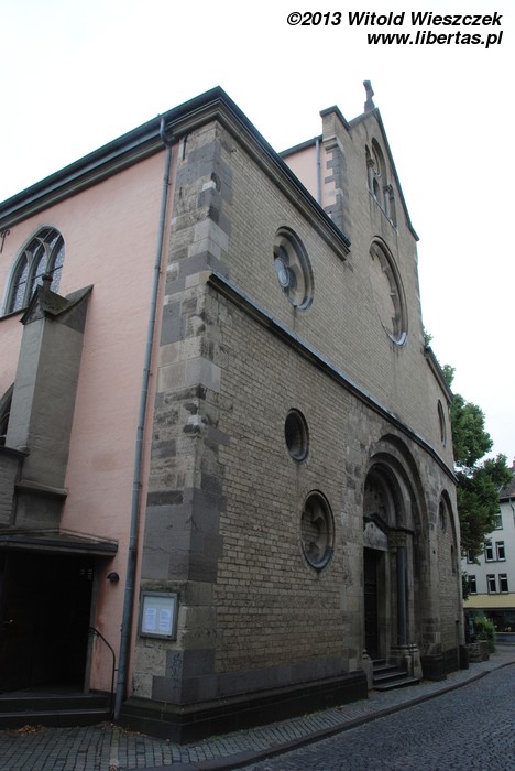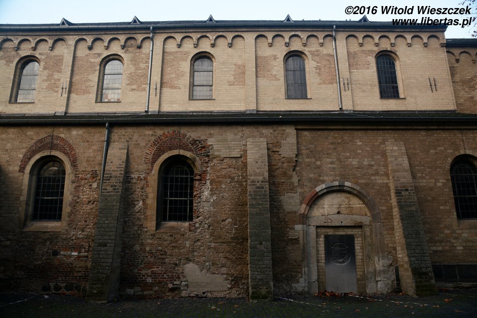 W porównaniu do pozostałych romańskich kościołów w Kolonii kościół Świętego Jerzego jest stosunkowo niewielki. W dodatku nie ma wieży, więc w pierwszej chwili nie byłem pewien czy dobrze trafiłem. Wzniesiony został w drugiej połowie XI wieku jako trójnawowa bazylika z transeptem. Później świątynię wielokrotnie przebudowywano, między innymi dobudowując kruchtę od północy oraz apsydy przylegające do prezbiterium.