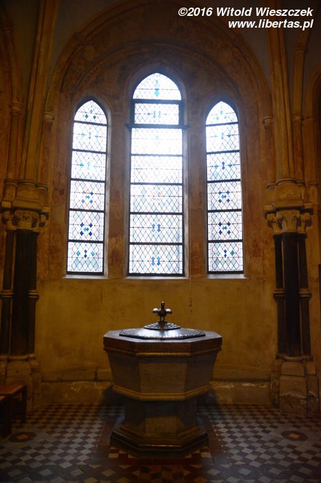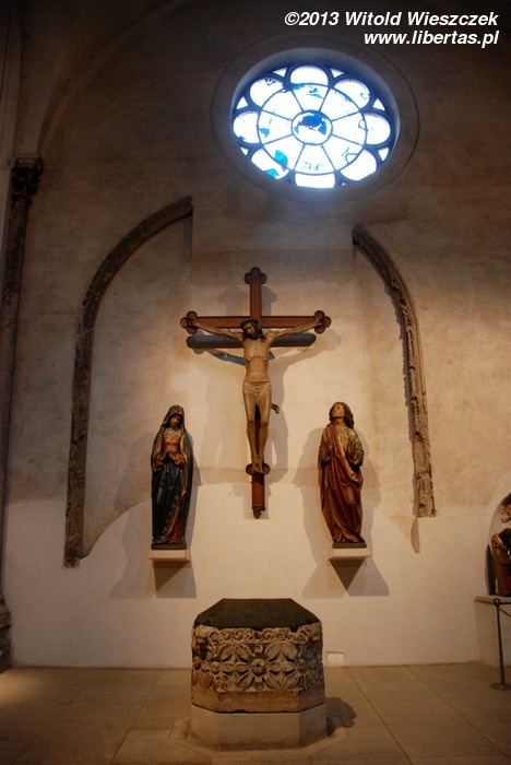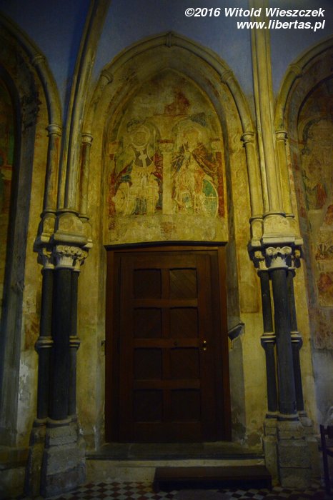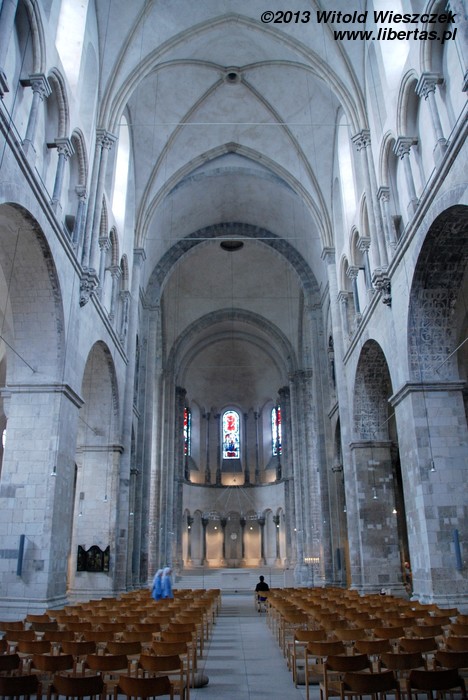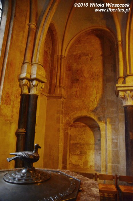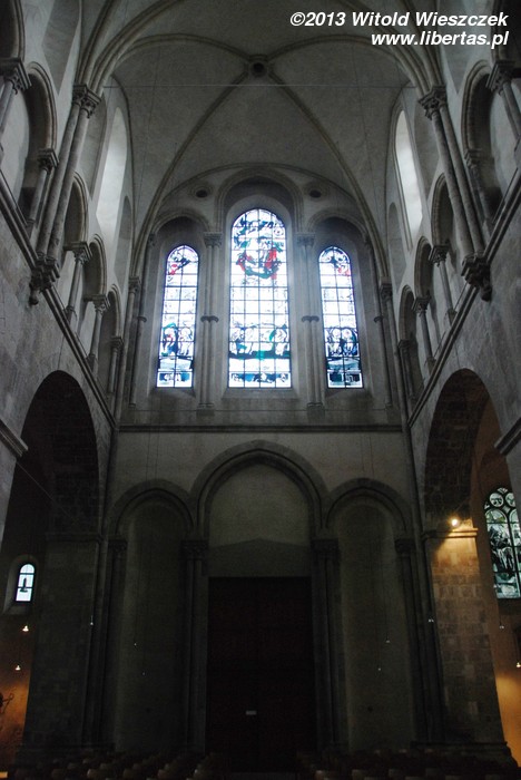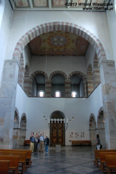 Wewnątrz świątyni warto zwrócić uwagę na późnoromańskie malowidła z połowy XIII wieku znajdujące się na sklepieniach. Podczas II wojny światowej kościół uległ poważnym uszkodzeniom, ale jakimś cudem sklepienia nawy głównej i kaplic pod wieżami nie uległy zawaleniu. Malowidła ocalały, a po wojnie zostały odnowione.