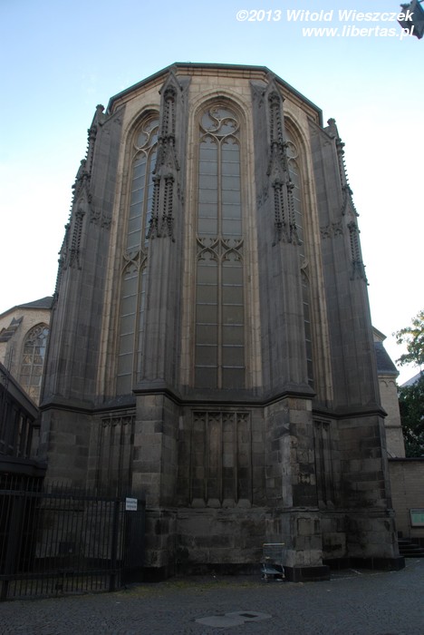 Na koniec zostawiłem sobie świątynię, która zrobiła na mnie chyba największe wrażenie. Historia kościoła Świętego Gereona sięga czasów cesarstwa rzymskiego. Św. Gereon, patron Kolonii, był legionistą, który przyjąwszy wiarę chrześcijańską, został za to wraz z towarzyszami zabity. W IV wieku zbudowano mu na terenie istniejącego tutaj cmentarza przykryte kopułą mauzoleum na planie owalu. Z czasem wyrósł z niego piękny kościół, który architektonicznie nawiązuje do tej pierwotnej budowli.