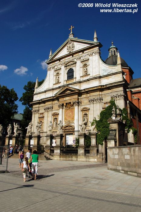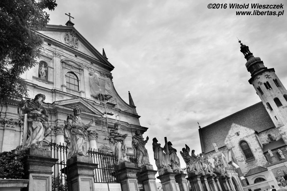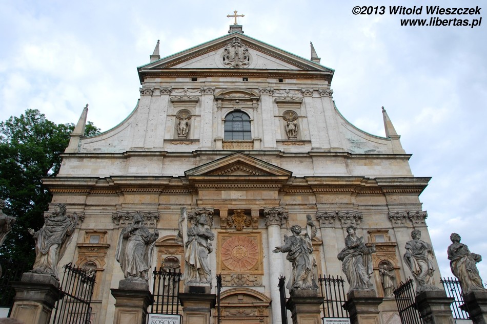 Kościół śś. Apostołów Piotra i Pawła został zbudowany w latach 1597–1619, co czyni go pierwszą barokową budowlą w Krakowie i jedną z pierwszych w Polsce. Do świątyni zaprasza nas dwunastu apostołów ustawionych na ogrodzeniu kościoła, którzy wraz z piękną fasadą są jego wizytówką. Architekt musiał mieć nadprzyrodzone moce, bo nie wyobrażam sobie, by wrażliwy człowiek przeszedł obok tego widoku obojętnie. Po prostu trzeba zajrzeć do środka, wkroczyć do wielkiej nawy głównej, zerknąć do kaplic, do niewielkiego, zakończonego absydą prezbiterium... Nie jestem wielkim fanem baroku, ale ten kościół bardzo mi się podoba.
