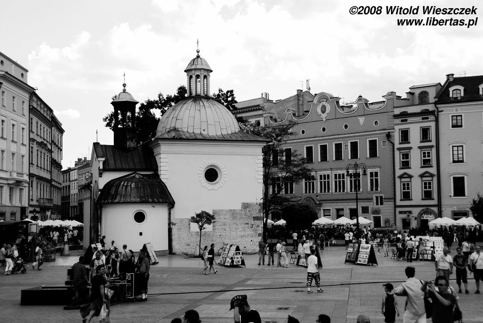 Niewielki kościółek św. Wojciecha jest jednym z najstarszych kościołów w Krakowie. Został zbudowany w II połowie XI lub na początku XII wieku w miejscu wcześniejszych drewnianych i murowanych świątyń. Być może jakiś drewniany kościółek wybudowano w tym miejscu już wkrótce po śmierci św. Wojciecha, który podobno wygłaszał był tutaj swoje kazania, zanim wyjechał nawracać Prusów. Świątynia, pierwotnie romańska, została przebudowana na początku wieku XVII, uzyskując bardziej barokowy charakter. Romańskie mury podwyższono, a całość nakryto barokową kopułą.