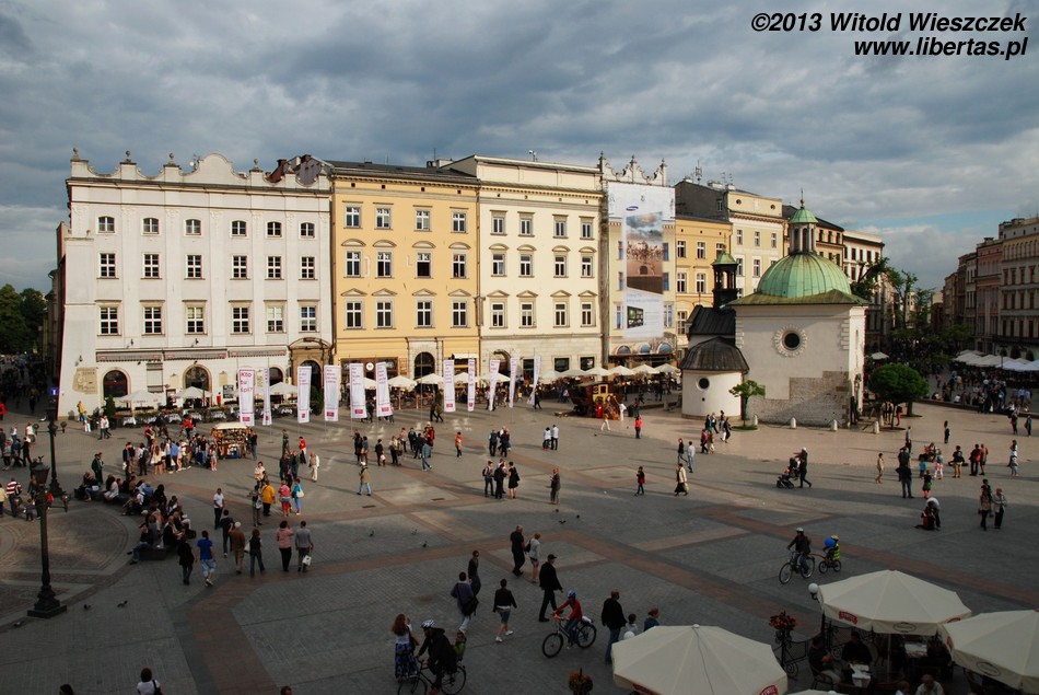 Główny plac Starówki wytyczono w roku 1257 na podstawie przywileju lokacyjnego wydanego przez Bolesława V Wstydliwego. Ma on kształt kwadratu o boku 200 metrów i jest jednym z największych rynków w Europie (choć wcale nie jest największy w Polsce). Najbardziej charakterystycznymi obiektami są tutaj Kościół Mariacki, niewielki Kościół św. Wojciecha, pomnik Adama Mickiewicza, Sukiennice i Wieża Ratuszowa. Warto zwrócić uwagę również na otaczające go kamienice, z których większość ma kilkusetletnią historię, a także płyty upamiętniające dwa ważne historyczne wydarzenia: Hołd Pruski (1525) i Insurekcję Kościuszkowską (1794) oraz pomnik Piotra Skrzyneckiego – twórcy kabaretu Piwnica pod Baranami.