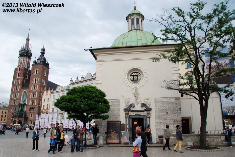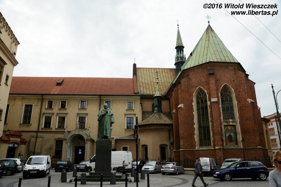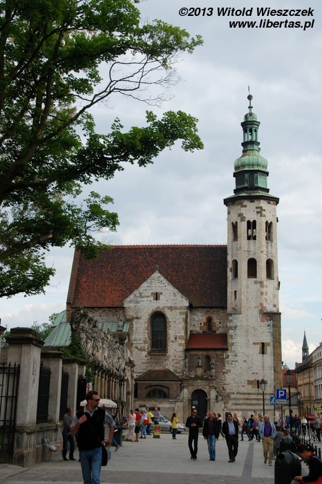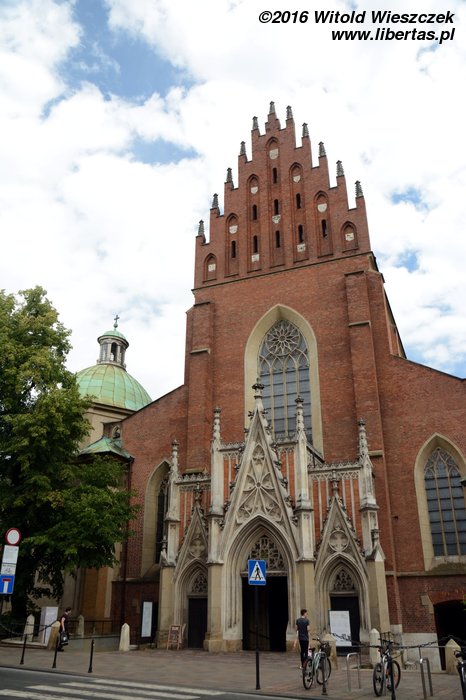 Dominikanów sprowadził do Krakowa w 1222 roku biskup Iwo Odrowąż, oddając im częściowo drewniany kościół Świętej Trójcy, który uległ zniszczeniu podczas najazdu tatarskiego. Niedługo później dominikanie rozpoczęli budowę nowego gotyckiego kościoła. Podobnież jak omawiany wyżej uległ on dużym uszkodzeniom podczas pożaru w 1850 roku, a fatalnie prowadzona odbudowa doprowadziła do katastrofy budowlanej. Ostatecznie odbudowa, w wyniku której wygląd świątyni uległ sporym i kontrowersyjnym zmianom, zakończyła się w roku 1884 roku. Z ciekawostek dodam, że w kościele pochowany jest Leszek Czarny, a w przylegających do kościoła zabudowaniach klasztornych można odkryć romańskie pozostałości...
