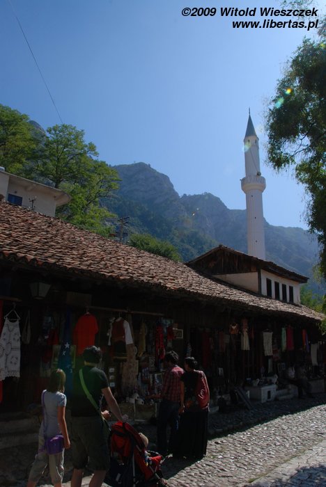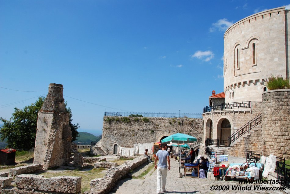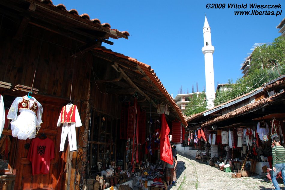 Idąc z zamku w kierunku centrum, przechodzimy przez bazar, na którym jest największy w całej Albanii wybór pamiątek. Oprócz standardowych kubków, koszulek i koronek znajdziemy tu również wyroby ze złota, srebra, starą broń, żelazka na duszę, a nawet nakręcane korbką działające patefony! Jeśli nie chcemy wydawać jakiejś większej gotówki, możemy kupić np. bransoletkę z Maryjkami za jedyne 100L albo koniak Skanderbeg za 2€.