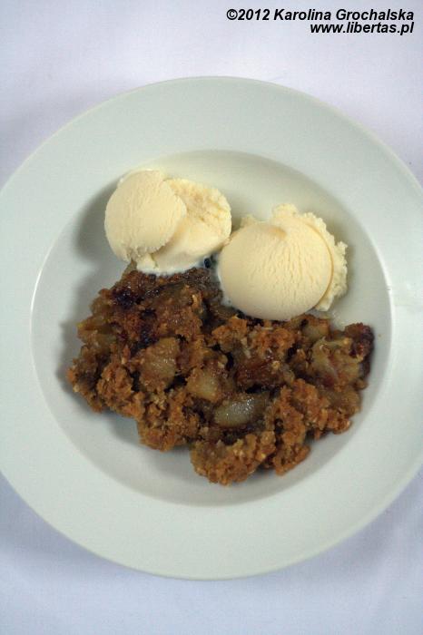 Jest coś takiego w deserach owocowych na ciepło, że mają moc ukojenia. Może to podświadome wracanie do papek z dzieciństwa, może tkwi w nas głęboko zakorzeniona tęsknota do matczynej piersi – ciepłej, miękkiej, słodkiej. Ale o czym ja to miałam...? A, o deserach. I o zimie. Bardzo ją lubię, ale chciałabym aby sobie już poszła. Choć ostatnie jej dni spędzam w nowym domu, gdzie mam szczęście posiadać kominek w kuchni – gdy drewno się w nim pali, ja lubię siąść przy stole i rozkoszować się tym smakowitym deserem. Do wiosny jeszcze kilka tygodni, można sobie pofolgować i celebrować koniec zimy klasykiem, prostym w wykonaniu, a bardzo smacznym – gorącymi owocami pod kruszonką.
