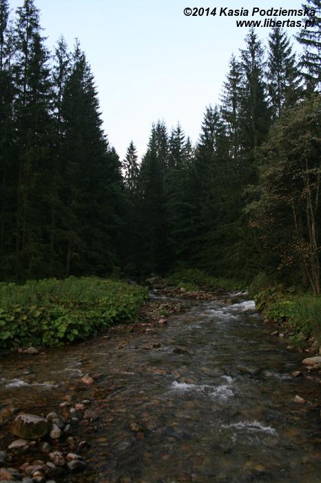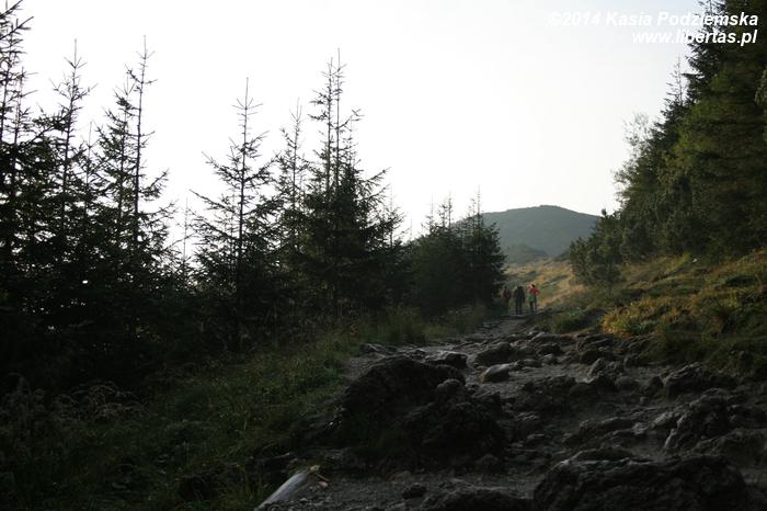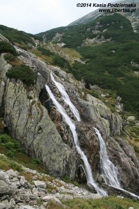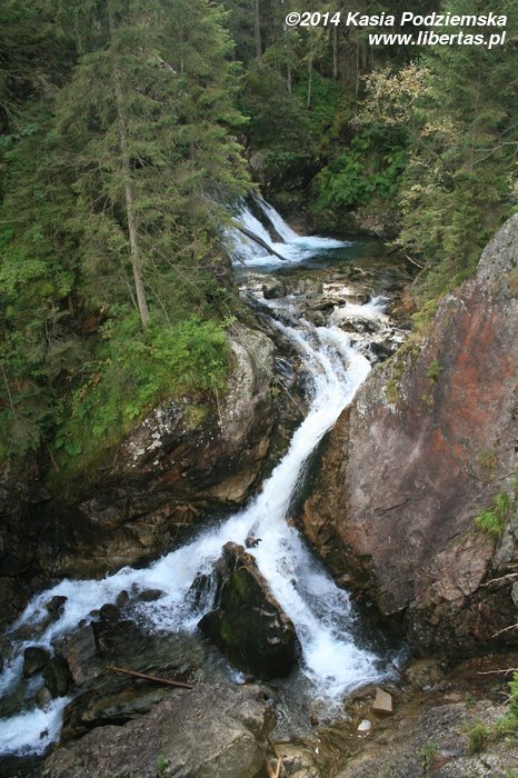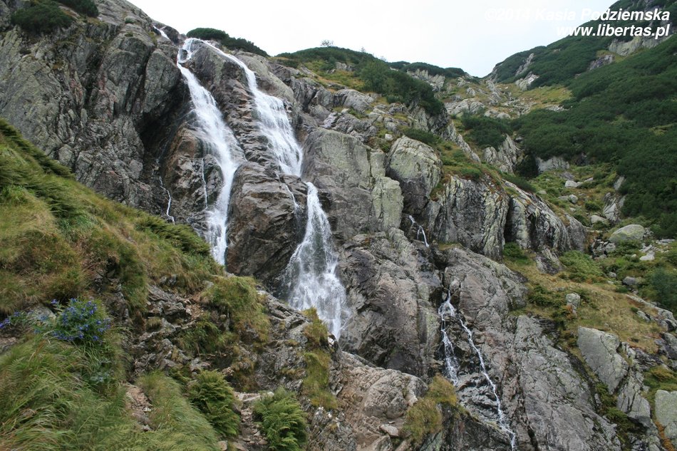 Od parkingu w Palenicy Białczańskiej dzielą nas jeszcze jakieś dwie i pół godziny. Rozpoczynamy więc zejście, przy okazji którego możemy zobaczyć Siklawę – największy wodospad w Tatrach. Wychodząc ze schroniska szlak rozwidla się: czarny omija ten 70-cio metrowy próg rzeczny, a zielony prowadzi tak blisko niego, że w wietrzne dni możemy nawet poczuć rozpryskujące się drobne kropelki na twarzy. Czas zejścia dla obydwu wariantów jest identyczny, a po około 40 minutach łączą się one w jeden – zielony). Na początku schodzi się niezbyt przyjemnie (nieco wygodniej jest na szlaku czarnym), trzeba ostrożnie stawiać nogi na skałach i mijać się z podchodzącymi turystami (więcej osób tędy wchodzi, niż schodzi). Ale nie jest to tak naprawdę duże utrudnienie, a po połączeniu się z czarnym szlakiem idziemy już coraz szerszą i sympatyczniejszą ścieżką wchodzącą powoli w las. Po dwóch godzinach jesteśmy już przy kolejnych kaskadach, czyli Wodogrzmotach Mickiewicza.