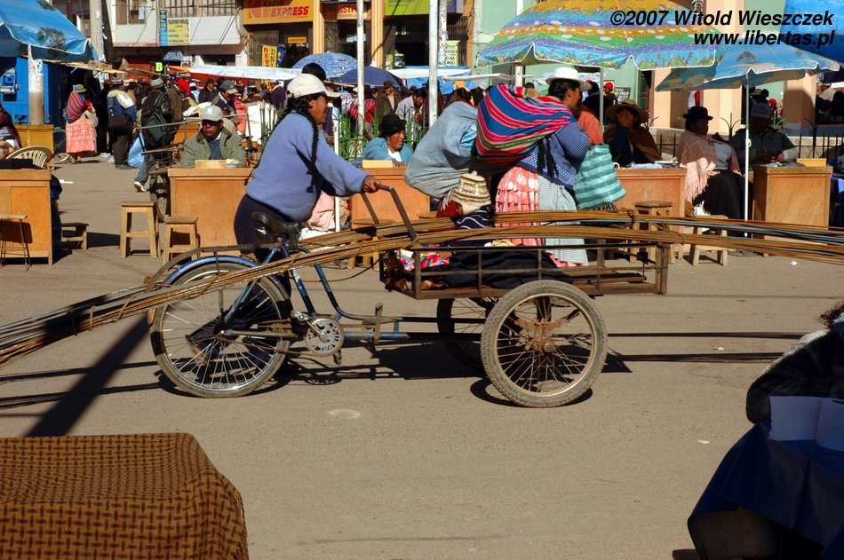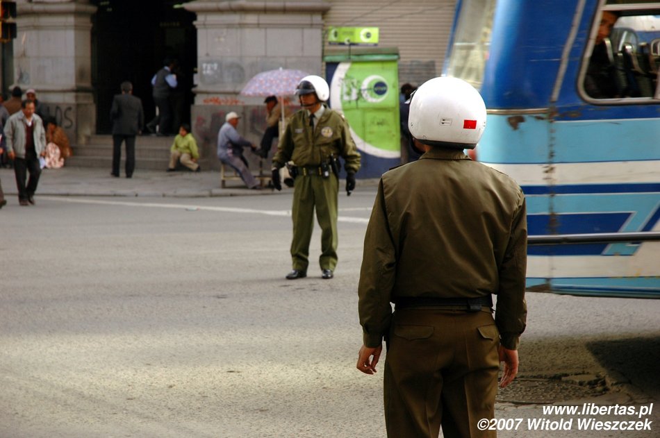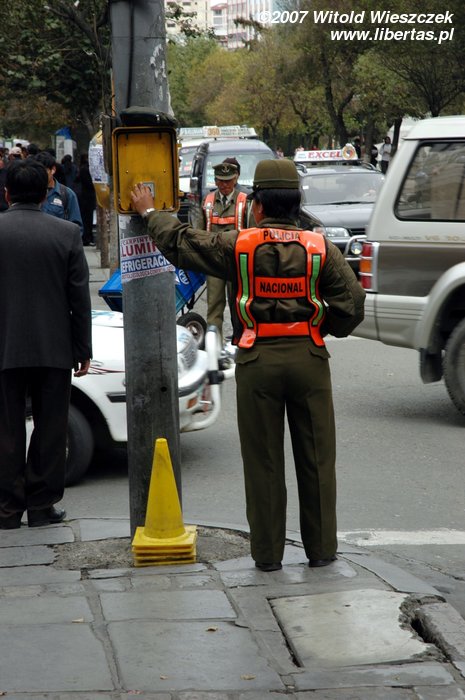 86 km to go and we are in La Paz – the almost-capital which is situated highest in the world! After leaving our stuff in a hotel we are going to the town to exchange the currency and fill our stomachs. On our way we marvel at the local colours, e.g. half-automatic traffic lights. Yes, good guess, a policewoman stands on each intersection and turns such a switch to change the lights: green/red... This is what happens when the workforce is cheaper than technology.