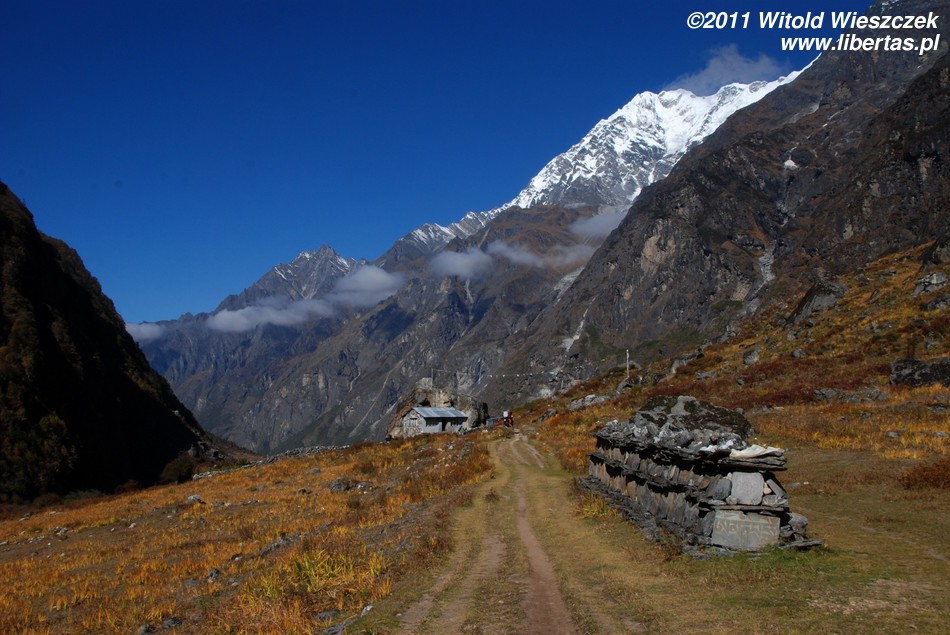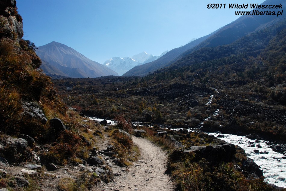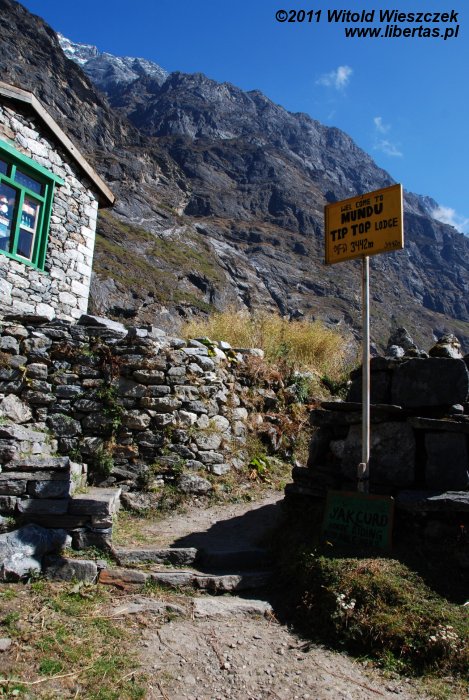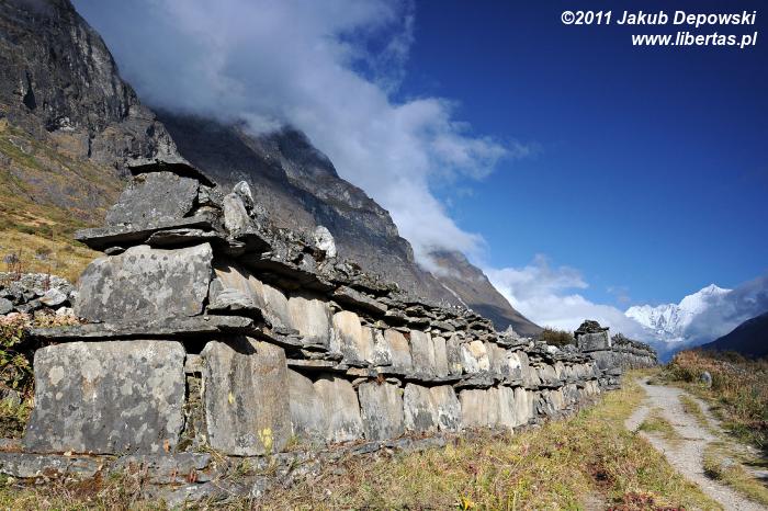 Zaraz za ostatnimi zabudowaniami Langtang (3430 m n.p.m.) ścieżka zaczyna się stromo wspinać. Wychodzimy na wzniesienie, z którego roztacza się ładny widok na wioskę. Minąwszy usytuowane przy ścieżce murki mani, dochodzimy do niewielkiej wioski Mundu (3442 m n.p.m.), za którą znajdują się kolejne murki.