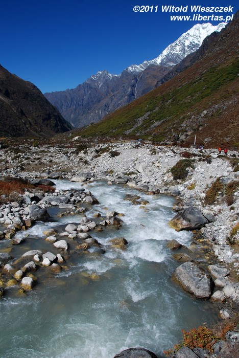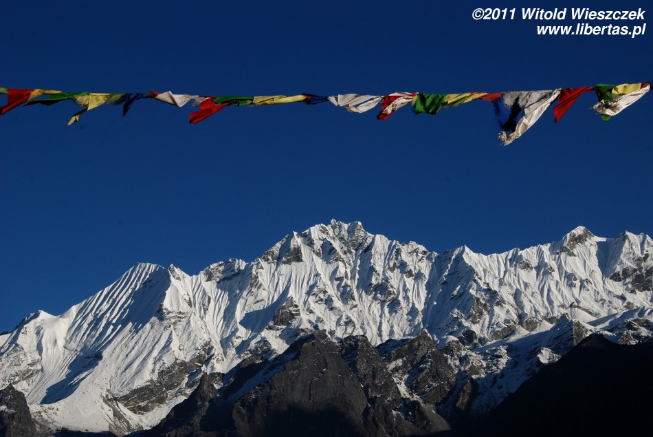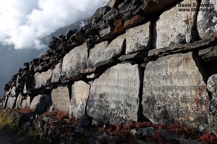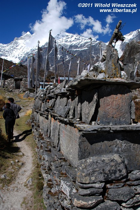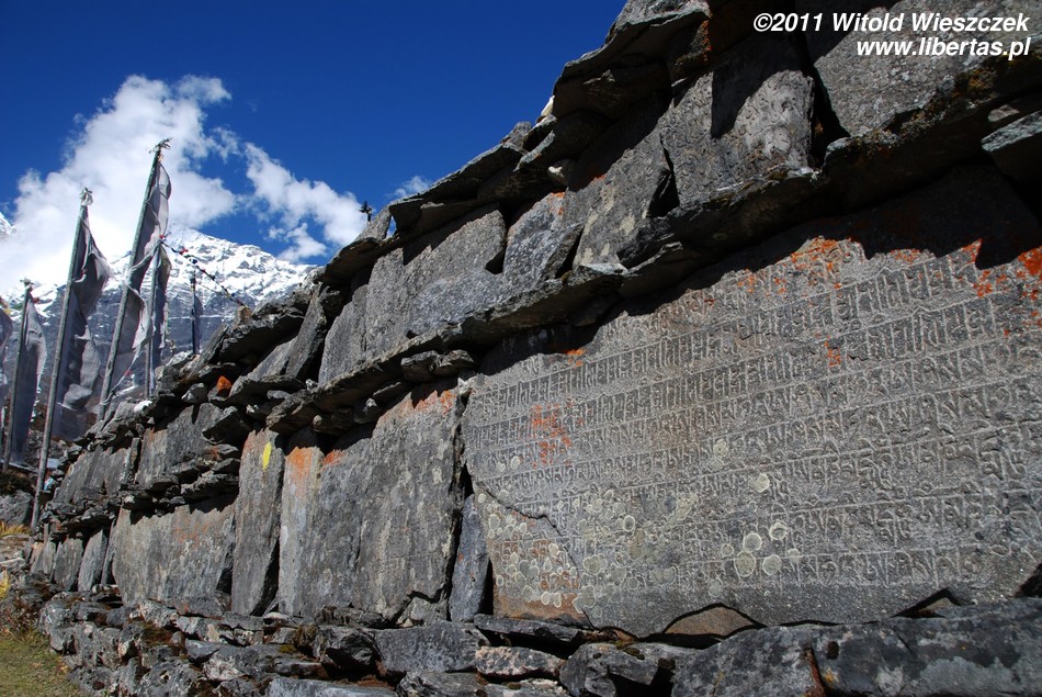 Mniej więcej po dwóch godzinach dochodzimy do Yamphu (3640 m n.p.m.), a po kolejnych 20 minutach – do betonowego mostu nad potokiem będącym dopływem rzeki Langtang. Za mostem, jakby na powitanie, powiewają modlitewne flagi, a na skale żarzy się kolorową farbą mantra: Oṃ Maṇi-Padme Hūṃ
