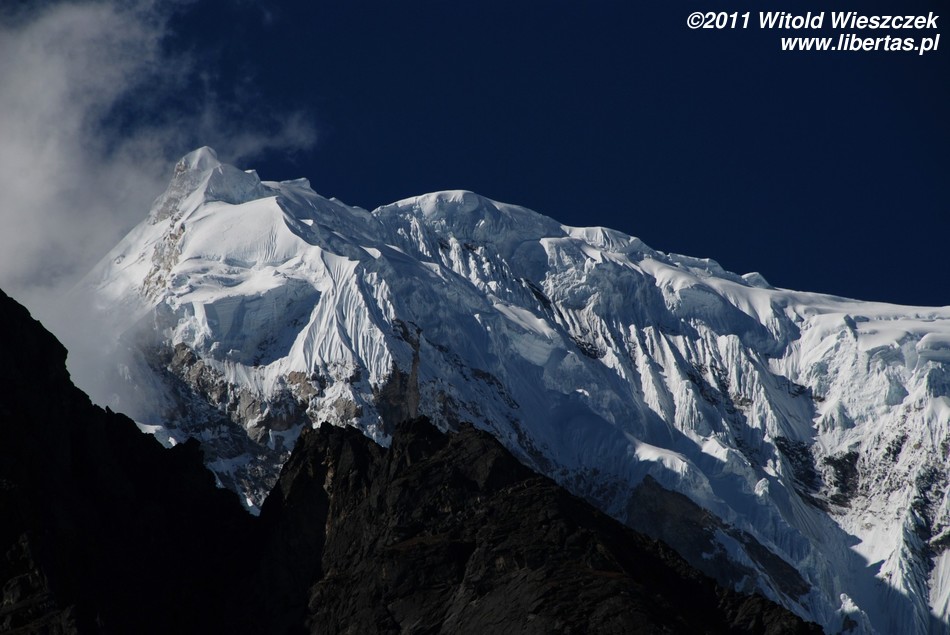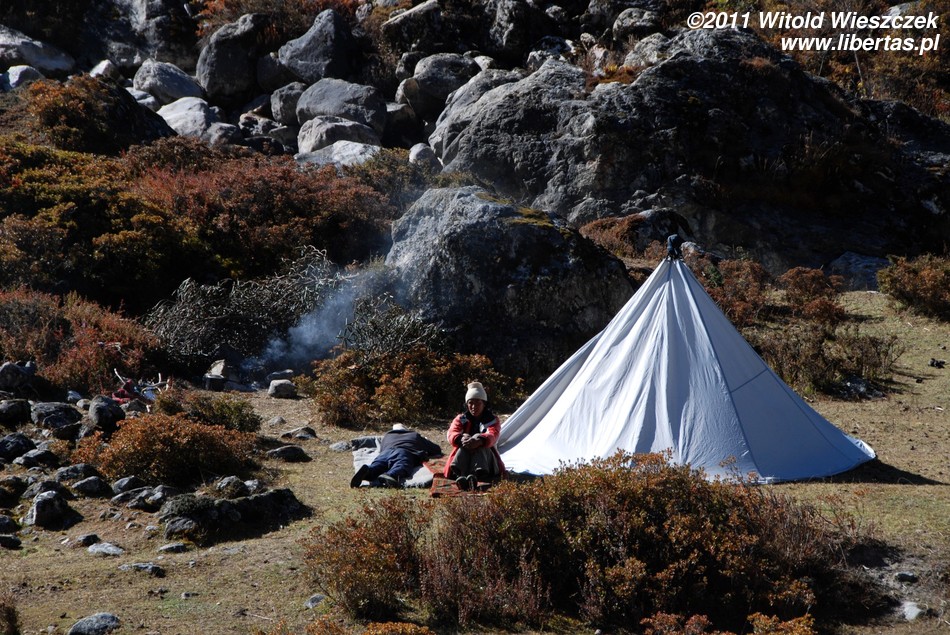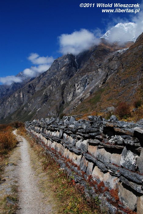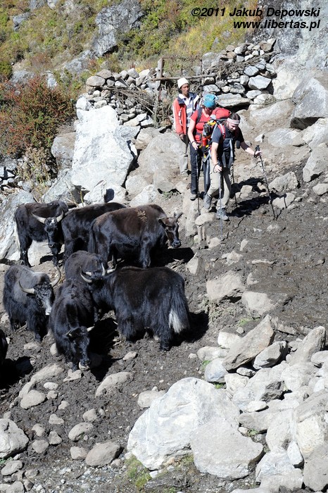 Ruch na ścieżce jest niewielki, czasem nie ma nikogo w zasięgu wzroku, więc nikt też nie przeszkadza w podziwianiu pięknych krajobrazów i nie zagłusza przyrody. Czasem wyprzedza nas grupa tragarzy, czasem my wyprzedzamy jakieś objuczone zwierzęta. Przytrafia nam się po drodze także śmierdząca, choć zabawna w gruncie rzeczy atrakcja w postaci wąskiego pasu ziemi okupowanego (może stąd pochodzi słowo okupacja?) i solidnie zaminowanego przez stłoczone na nim jaki. Ogrodzone płotem terytorium przecina naszą ścieżkę tak, że nie bardzo możemy je ominąć. Jedyna szansa, by uniknąć brodzenia we wdeptanych w ziemię i wydzielających bardzo intensywną woń odchodach, to przejść po śliskich kamieniach. A co w razie niepowodzenia? Najbliższa automatyczna pralka jest chyba w Katmandu.