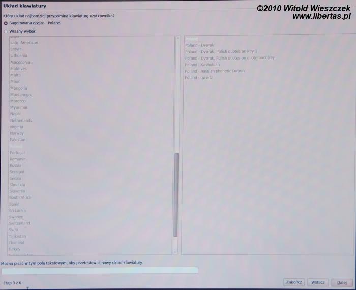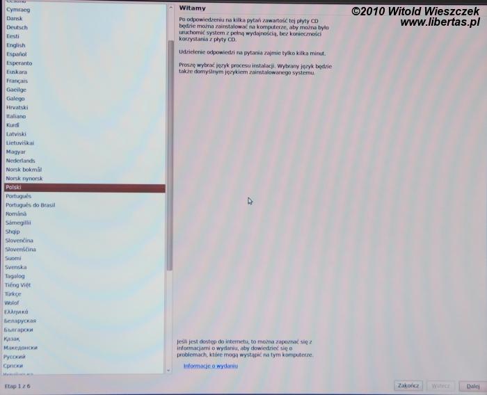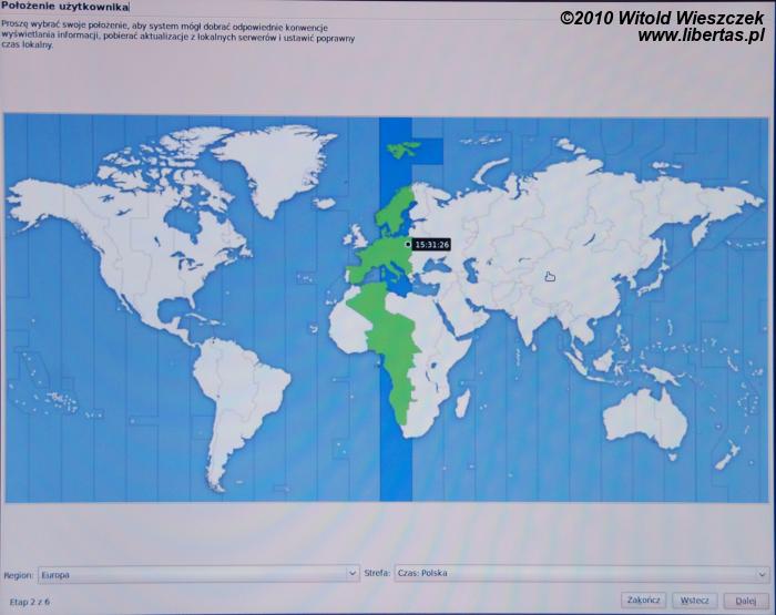 Na początku zostaniemy poproszeni o wybór języka – domyślnie jest to język polski. Następnie wybieramy strefę czasową – tu chyba wybór jest równie oczywisty – oraz układ klawiatury. W zasadzie dla większości użytkowników będzie to kliknięcie trzy razy w klawisz dalej.
