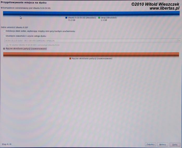 Najwygodniej i najprościej jest oczywiście w sytuacji, gdy mamy czysty dysk, ew. wszystkie dane zrzuciliśmy na płyty i możemy sobie pozwolić na podzielenie dysku od nowa. Jeśli chcemy używać również Windowsa, to proponuję zainstalować go w pierwszej kolejności. Jeśli mamy duży dysk możemy sobie pozwolić na lekką rozpustę i w trakcie instalacji przydzielić mu partycję 10-20GB. Pozostałą część dysku najlepiej zostawić na razie niezagospodarowaną.