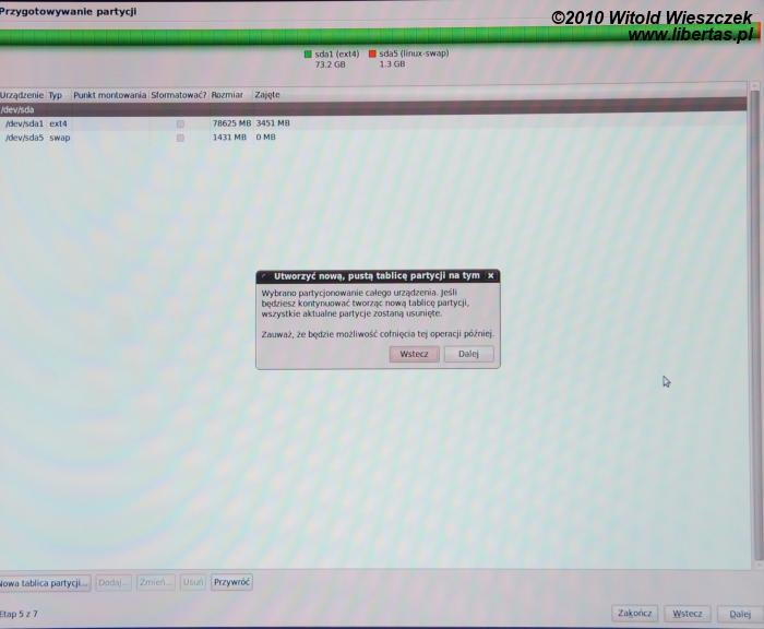 Jak już mówiłem, dzień wcześniej Maja instalowała system samodzielnie, na powyższym zdjęciu widzimy więc, że dysk jest już podzielony na partycje. Chcemy wszystko zrobić od nowa, w związku z tym Maja zaznacza urządzenie /dev/sda i klika w guzik "Nowa tablica partycji". UWAGA! Ta operacja spowoduje utratę wszystkich danych na dysku! Jeśli wcześniej zainstalowałeś Windowsa, a teraz chcesz zainstalować drugi system nie likwidując pierwszego, pomiń ten krok!