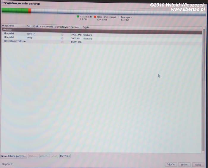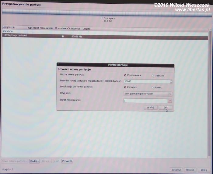 Teraz podświetlamy "dostępna przestrzeń" i klikamy w guzik "Dodaj" znajdujący się u dołu ekranu. Otworzy się okno w którym określamy wielkość partycji (jeśli dysponujecie w miarę dużym dyskiem proponuję 10GB, czyli 10000MB), wybieramy punkt montowania "/" i klikamy "OK". Powinniśmy teraz zobaczyć nową partycję, jeśli dysk był czysty i wybraliście typ "partycja podstawowa" będzie to /dev/sda1 - czyli pierwsza partycja na pierwszym dysku. Jeśli wcześniej na dysku znajdował się Windows będzie to pewnie /dev/sda2.