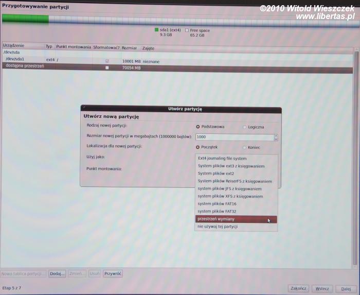 Ponownie klikamy w "dostępna przestrzeń, która po poprzedniej operacji powinna się skurczyć o 10000MB i w analogiczny sposób tworzymy kolejną partycję. Będzie to partycja wymiany, coś, co pełni tę samą rolę, co plik wymiany w systemie Windows. Proponuję ustawić jej rozmiar na tyle, ile mamy pamięci ram, jednak nie więcej niż 1000MB. Następnie wybrać z listy "użyj jako" pozycję "przestrzeń wymiany", tak jak to widać na zdjęciu powyżej.