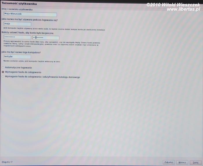 Teraz instalator spyta nas o dane pierwszego użytkownika i nazwę dla komputera. Maja wpisuje Imię i Nazwisko, hasło, oraz nazwę dla nowego komputera na cześć swojego ulubionego zespołu Betty Be:). W tym miejscu może też wybrać, czy chce by system automatycznie ją logował bez wymagania hasła. Gdy wprowadzimy wszystkie dane instalator spyta nas czy wszystko się zgadza. Jeśli tak, klikamy "zainstaluj". Reszta zrobi się sama, a my w tym czasie możemy sobie poczytać kolejne ekrany...