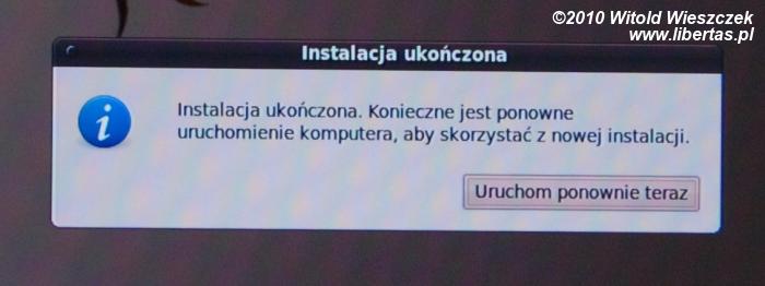 Na końcu instalator poinformuje nas, że zakończył instalację. Klikamy "uruchom ponownie teraz". Wyciągamy płytę instalacyjną z napędu, aby nie rozpocząć procesu od nowa, i naciskamy ENTER.