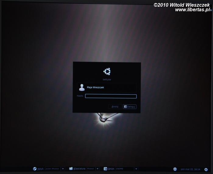 Po chwili powinniśmy zobaczyć ekran startowy Ubuntu, a w zależności od prędkości komputera, po kolejnych kilkunastu, kilkudziesięciu sekundach – ekran logowania. Podajemy swój login i hasło, które podaliśmy podczas instalacji i po raz pierwszy logujemy się do naszego nowego systemu. W przeciwieństwie do Windowsa Ubuntu jest już praktycznie gotowy do pracy, zawiera zaawansowany pakiet biurowy OpenOffice, edytor graficzny GIMP, przeglądarkę internetową Firefox i wiele innych. Pozostaje nam tylko skonfigurować sieć.