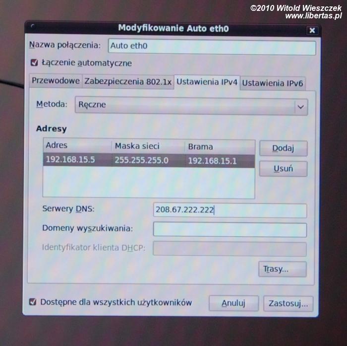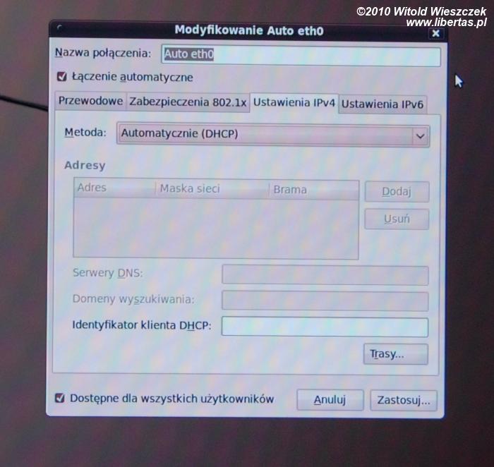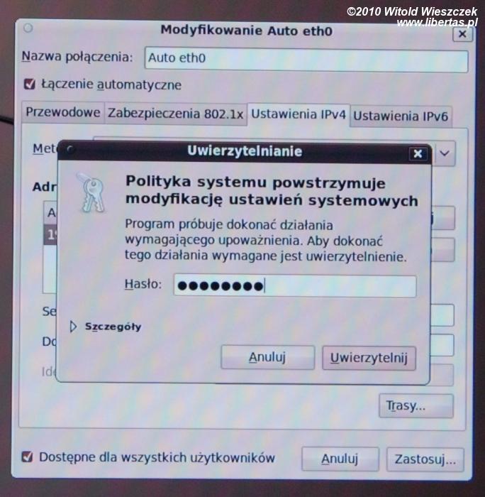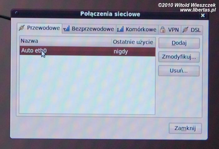 Jeśli nasz komputer jest podłączony do sieci kablowej w której znajduje się serwer DHCP, to od razu powinniśmy móc korzystać z Internetu i nie musimy w zasadzie dalej czytać. W przeciwnym wypadku musimy jeszcze ten drobiazg skonfigurować, co powinno nam zająć mniej niż minutę. Maja jest do sieci podłączona kablem, w związku z tym klika prawym klawiszem myszki w ikonę sieci, która znajduje się na pasku u góry, po prawej stronie. Wybiera "zmodyfikuj połączenia", zakładkę "przewodowe", wybiera "auto eth0", następnie IPv4 i zmienia "automatyczne (DHCP)" na "ręczne". Teraz klika guzik "dodaj" i dodaje nasze połączenie poprzez wpisanie adresu IP, maski sieci, bramy i serwera DNS – te dane uzyskamy od naszego dostawcy Internetu. Teraz system poprosi nas o potwierdzenie zmian swoim hasłem i voila, sieć powinna działać.