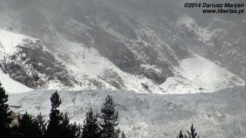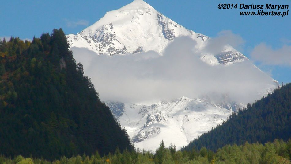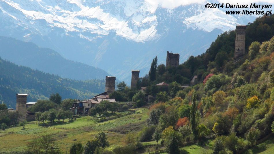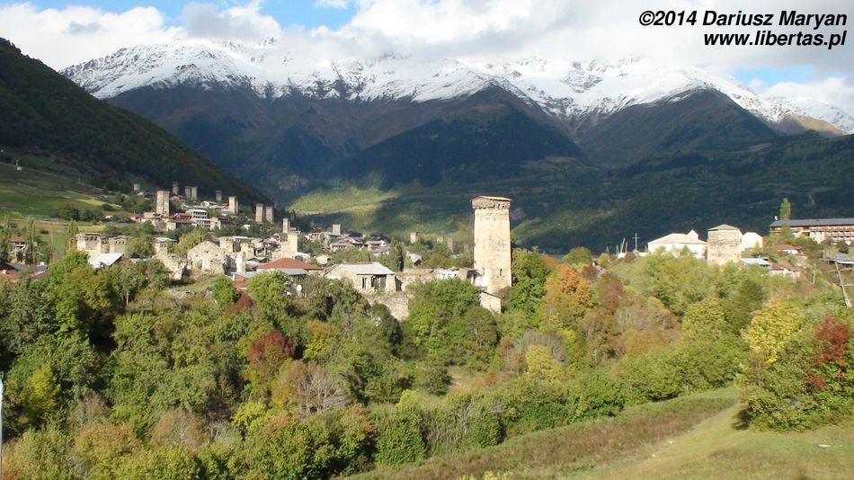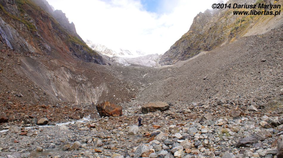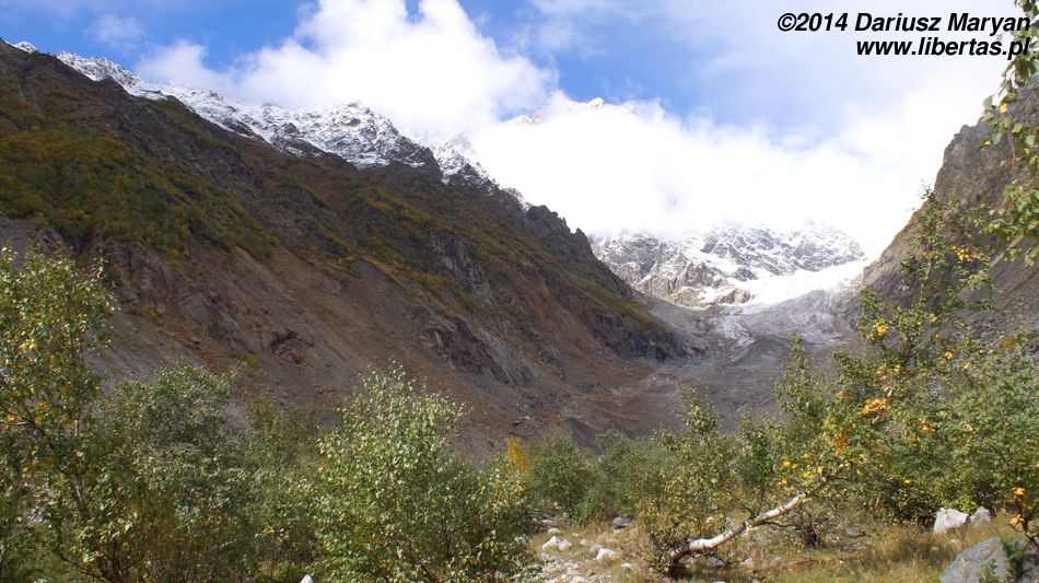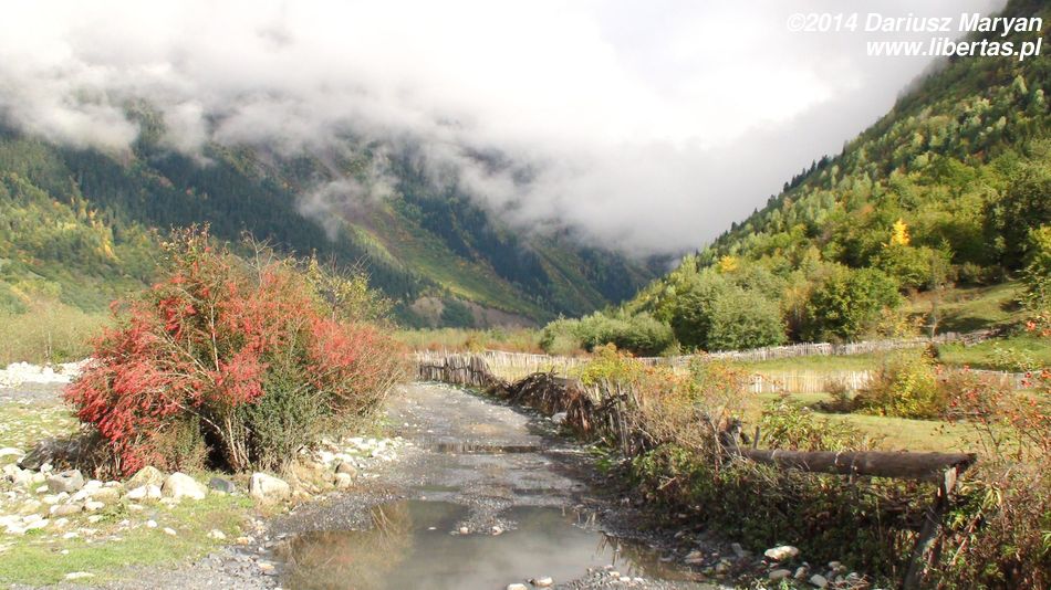 Po opuszczeniu miasta droga pod lodowiec biegnie cały czas doliną, przez którą płynie rzeka Mestiachala. Dolina ta jest przejezdna, więc teoretycznie można podjechać kilka kilometrów, jednak my woleliśmy całą trasę pokonać pieszo. Tego dnia bowiem mieliśmy dużo czasu, a i pogoda zaczęła dopisywać.