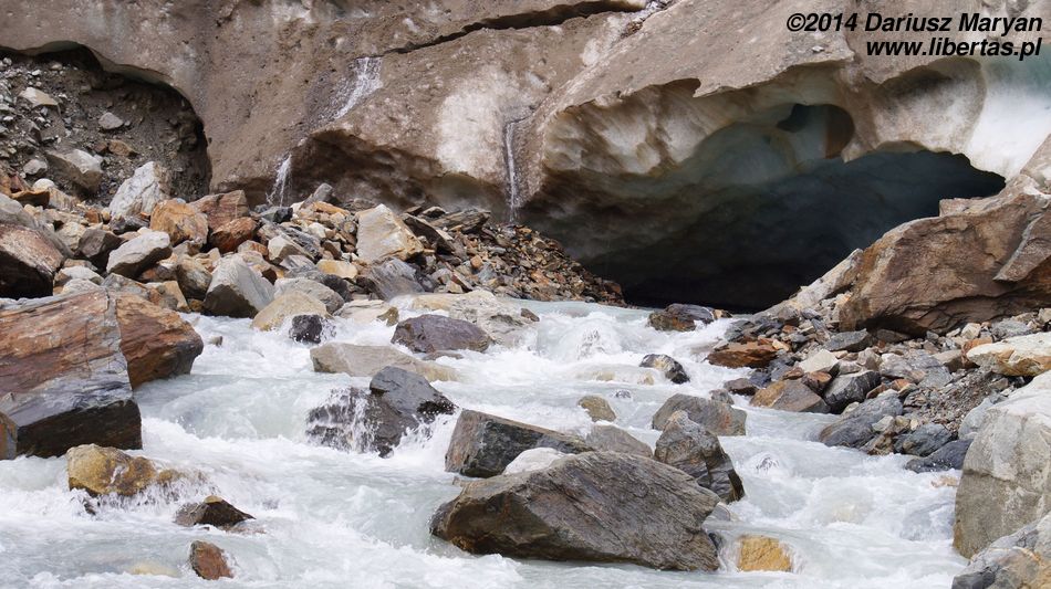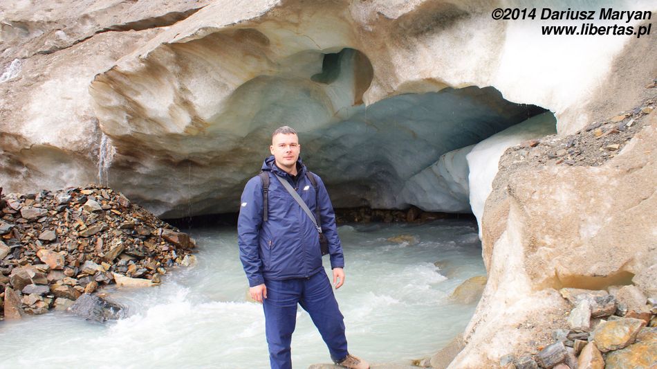 Z lodowca, na który ostatecznie weszliśmy, wypływa wspomniana wyżej rzeka. Widok jest spektakularny. Ze względu na ciepłą porę roku lodowiec odsłonił przed nami piękną niszę, która mieniła się delikatnym błękitnym kolorem. W tym miejscu zrobiliśmy sobie dłuższą przerwę. Piesek kilka razy podchodził do innych turystów, ale za każdym razem grzecznie do nas wracał. Widocznie nie mieli nic lepszego do jedzenia od nas.