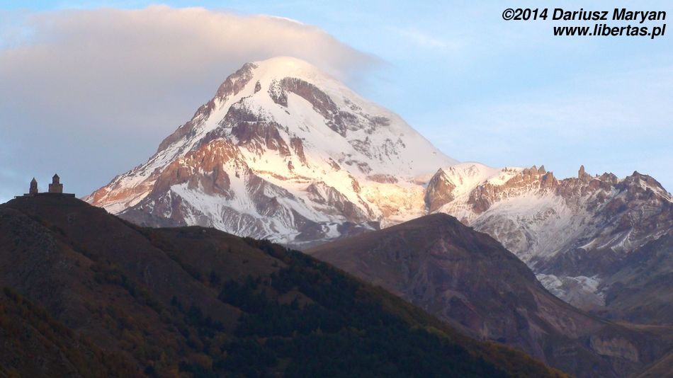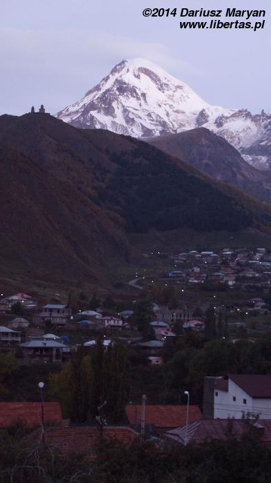 Kolejny dzień naszej Gruzińskiej przygody zaczął się od mocno oczekiwanego widoku. Po wyjściu na taras naszego pensjonatu zobaczyliśmy w końcu Kazbeka, ukazał się w całej krasie. Co prawda widzieliśmy wcześniej zdjęcia tej góry, ale na żywo widok był nieporównywalnie lepszy. Prezentuje się szczególnie pięknie, gdy jego górne części oświetla wschodzące słońce, a miasteczko w dole jest jeszcze pogrążone w nocnej ciszy.