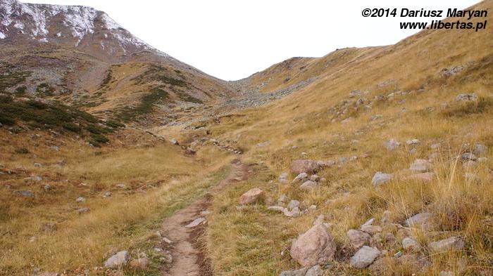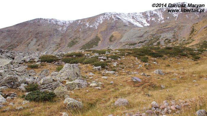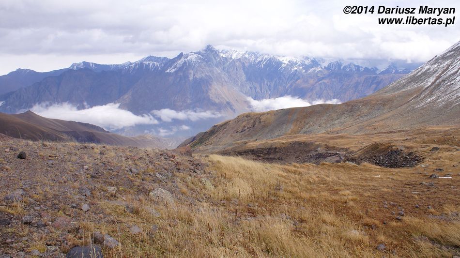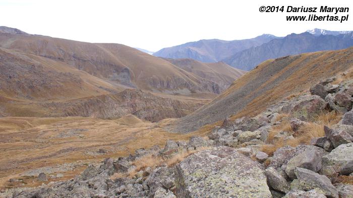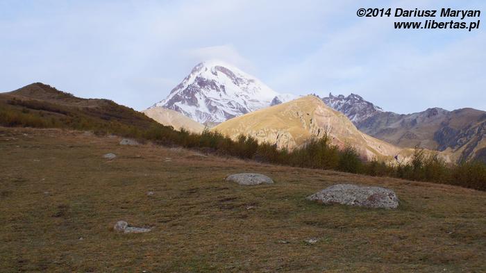 Po minięciu niewielkiego lasku szliśmy po rozłożystym grzbiecie, który wznosi się ku skalistej grani zamykającej panoramę od południowego-zachodu. Po pewnym czasie Kazbek przestał być widoczny, z prawej strony zasłaniało go niewielkie wzniesienie. Aby temu zaradzić, wspiąłem się na nie, zbaczając nieco z utartej ścieżki.