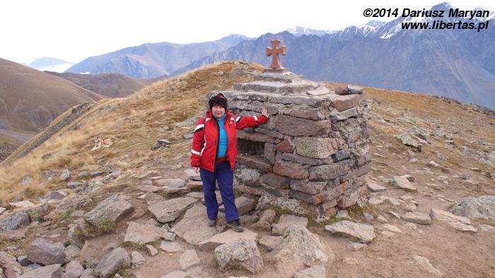 Dalej droga prowadziła wprost do Przełęczy Krzyżowej. Z tego miejsca widać już Lodowiec Gergeti. Dalej trasa wiedzie wśród coraz liczniejszych głazów i kamieni. Przyroda staje się uboższa, ustępuje miejsca skałom. Po pewnym czasie dochodzimy do polodowcowego potoku, który należy przejść w bród po kamieniach.