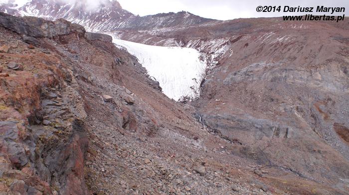 W tym miejscu warto uzupełnić zapas wody. Następnie wzdłuż wielkiego polodowcowego leja posuwamy się pośród coraz większych głazów w kierunku coraz bliższego Kazbeka. Po prawej stronie widać czoło lodowca. Można zejść na dół i w tym miejscu zakończyć spacer, my jednak chcieliśmy podejść wyżej w pobliże stacji meteo i zagłębić się nieco w lodowiec.