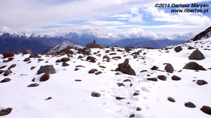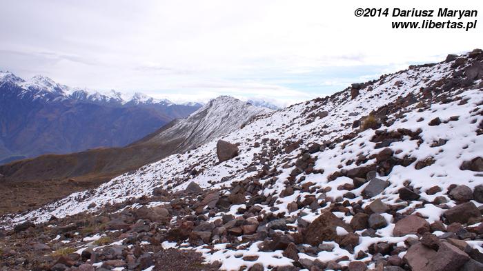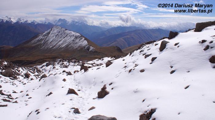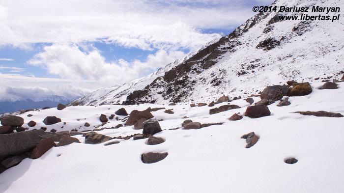Z każdym metrem przybywało śniegu i po pewnym czasie otoczenie z jesiennego przekształciło się całkowicie w zimowe. Widoki były niesamowite, na dodatek pogoda jakby chciała nam wynagrodzić gorsze dni i tym razem dopisała. Okoliczne szczyty skrzyły się w słońcu, a niebo zlewało się z ziemią w jeden obraz.