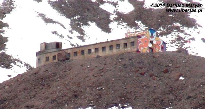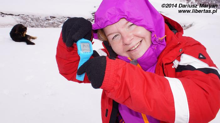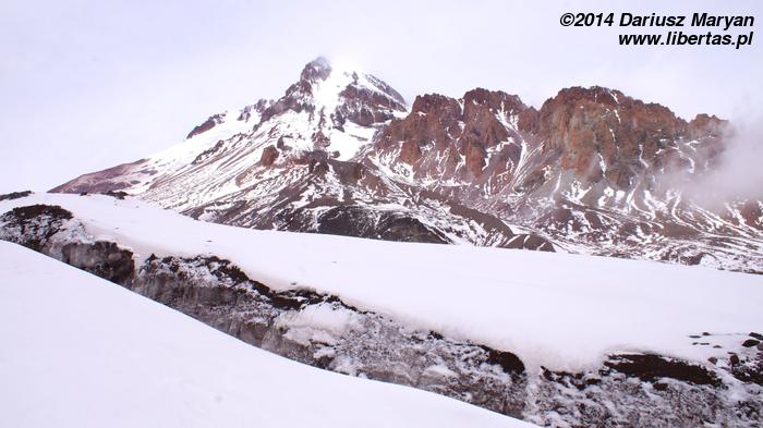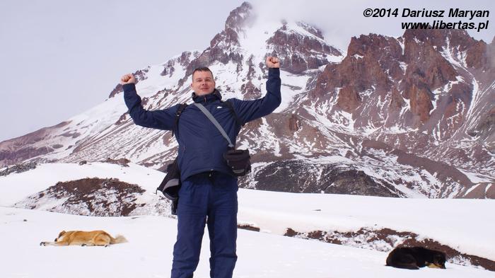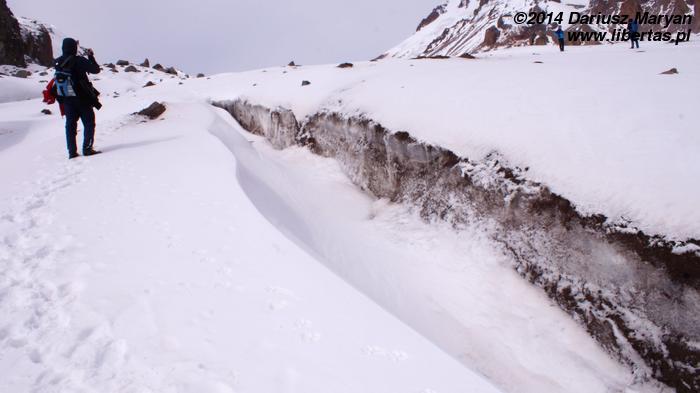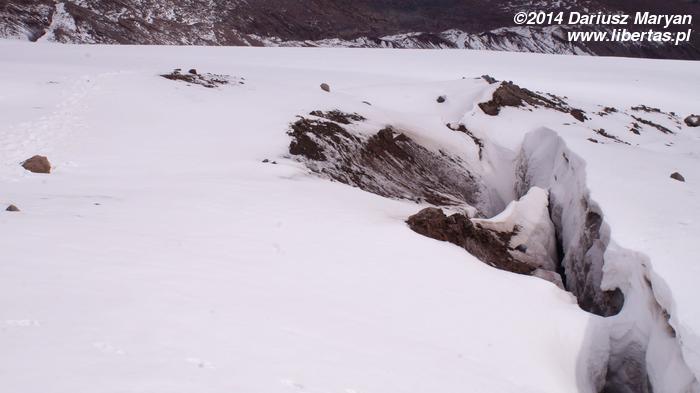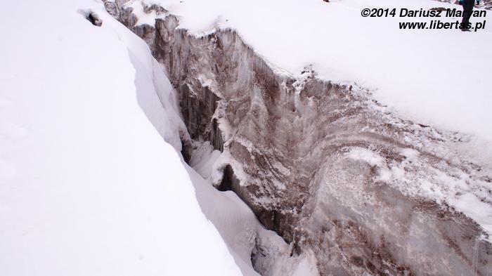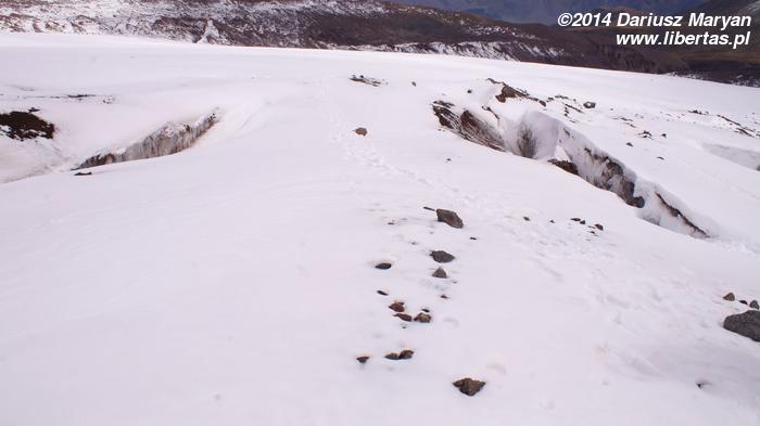 W końcu dotarliśmy na lodowiec. Szliśmy ostrożnie za naszymi pieskami, omijając nieciekawe szczeliny i wyrwy w lodzie, z których w razie upadku bez pomocy innych można by się nie wydostać. Gdy dotarliśmy na wysokość 3435 metrów, uznaliśmy, że jesteśmy na samym środku lodowca i cel wyprawy został osiągnięty. Z jednej strony mięliśmy szczyt Kazbeka i stację meteo, z drugiej Przełęcz Krzyżową i Kazbegi. W tym miejscu śniegu było już dobrych dwadzieścia centymetrów.