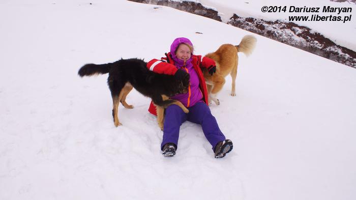 Tak więc ruszyliśmy w drogę, po prawej stronie towarzyszył nam Kazbek, a po lewej kilka psów. Grzecznie czekały na turystów przy klasztorze, ponieważ jednak o tej porze byliśmy tam tylko my i dwaj Niemcy to całe stadko ruszyło za nami. Wypadało po piesku na człowieka. Co ciekawe każdy pilnował jednej osoby, nawet jak się stopniowo rozdzielaliśmy na trasie.