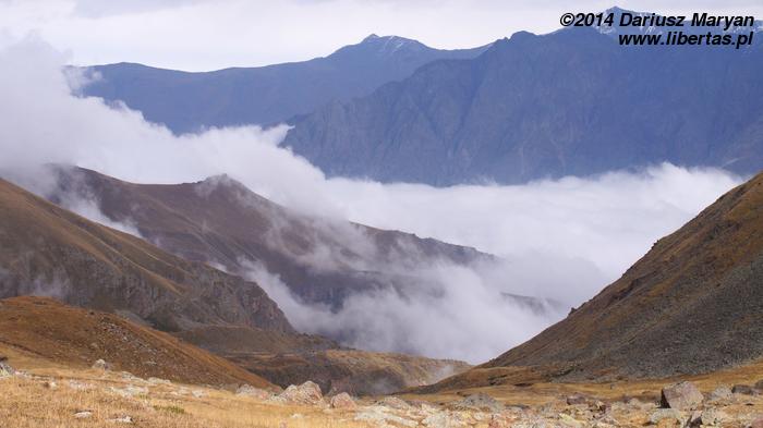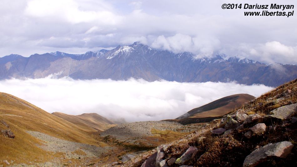 Gdy wróciliśmy na Przełęcz Krzyżową, zobaczyliśmy, że całe Kazbegi wraz z klasztorem spowijły gęste chmury, które zatrzymały się na pewnej wysokości, jakby dalej nie miały już siły się wspinać. Bardzo lubię takie zjawisko, kiedy poniżej chmury tworzą nieprzeniknioną zasłonę, a ponad nimi świeci piękne słońce. Tak więc ciesząc się, że w tym momencie jesteśmy ponad chmurami, zwolniliśmy kroku, aby jak najdłużej nacieszyć się widokami.