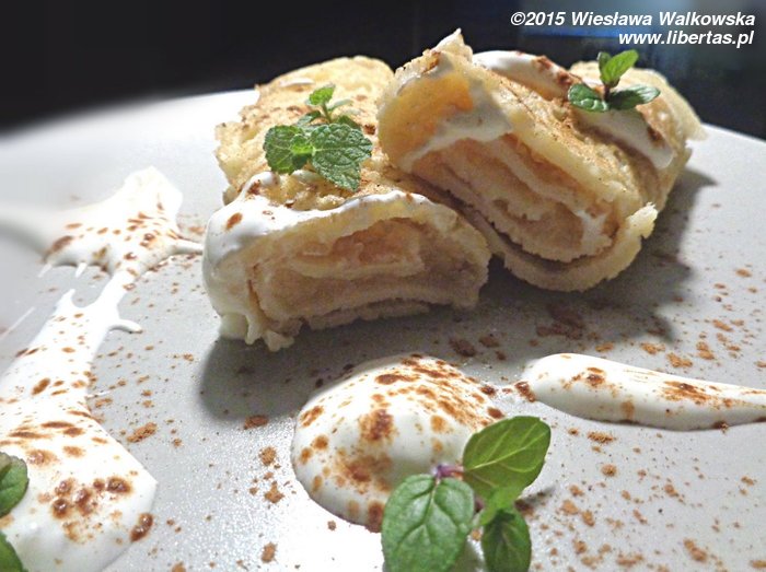 Gotowe naleśniki posmaruj marmoladą jabłkową i zwijaj w rulony. Możesz dodać trochę jogurtu na górę i oprószyć delikatnie cynamonem.