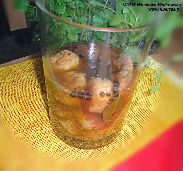 Do gotującej się wody dodaj ocet winny. Kiedy zalewa lekko przestygnie, dodaj ją do ułożonych w naczyniu kulek śledziowych.