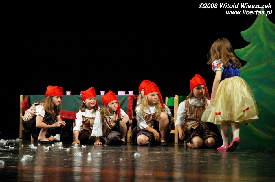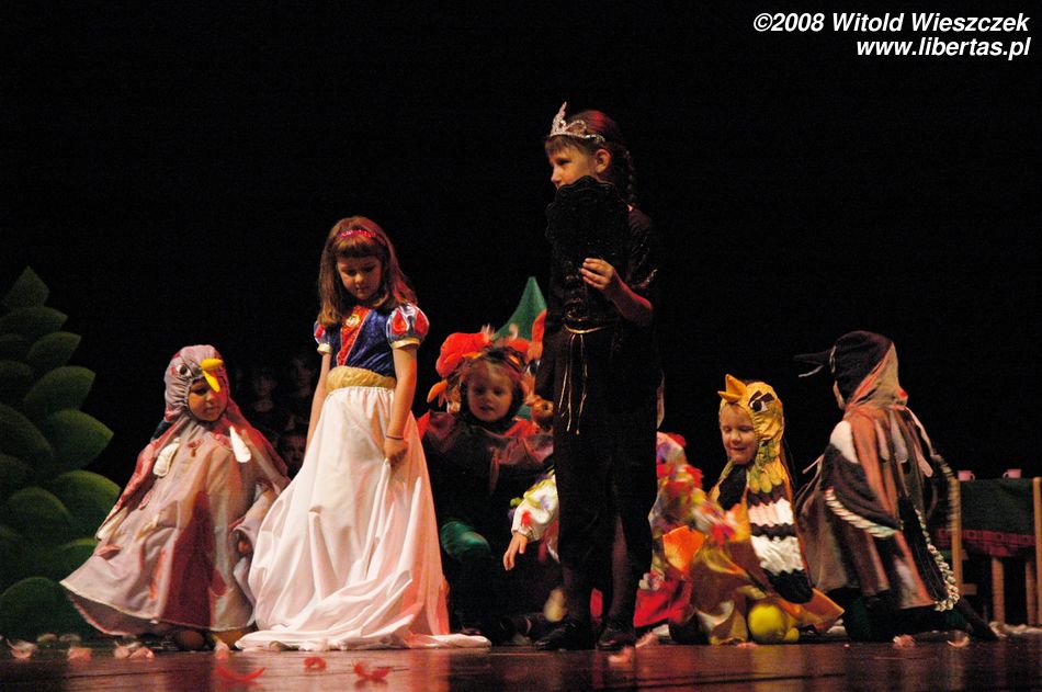 Na początku wystąpiło przedszkole niepubliczne imienia Kubusia Puchatka, w przedstawieniu pt. Królewna Śnieżka. Dzieci zagrały bardzo ładnie, stroje i scenografia były bardzo profesjonalnie przygotowane, a śmiech złej czarownicy przeszywał jak sztylet! Jednym słowem w skali 2–5 zasłużona piątka!
