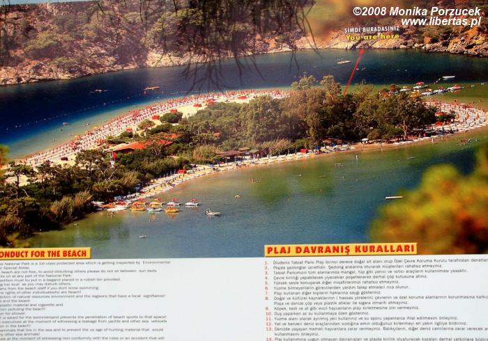 Wielu miłośników słońca i mocnych wrażeń udaje się jakieś 14 km na południe od Fethiye, by zobaczyć podobno jedno z najpiękniejszych miejsc na świecie. Największą atrakcją jest piaszczysta laguna. Jej charakterystyczny kształt widnieje w każdym folderze, w każdym katalogu biura podróży jako symbol tureckiego raju. Sama laguna została objęta ochroną (w 1978 roku utworzono tu park narodowy), a wstęp na nią jest płatny. Zakazano na niej budowy jakichkolwiek hoteli czy ośrodków wypoczynkowych. Te oczywiście powstały, ale już poza tym miejscem. Laguna niemalże „zamyka” fragment zatoki i skutecznie oddziela ją od otwartego morza, przez co woda w tym miejscu zachowuje stałą temperaturę.