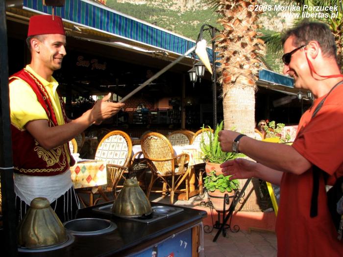 W drodze do hotelu zostajemy zatrzymani przez ulicznego sprzedawcę lodów. No tak, nie sposób opuścić to miejsce i nie spróbować smaku tutejszych lodów. Sprzedawca okazał się wprawnym „magikiem”, który zanim sprzedał nam porcje lodów, z wielkim zadowoleniem droczył się z nami przez dobre parę minut. Nabierał porcje lodów łyżką na długim kiju, po czym zostawiał nas z pustym wafelkiem. To znowu pokazywał nam inne sztuczki... Złap sobie ten kubek z lodem, co przyklejony częścią lodową do kija wprawnym ruchem wiruje nad Twoją głową, a następnie tuż przy dłoniach pragnących go złapać... Już prawie się udało, ale co to? Sprzedawca znowu wprawnym ruchem wyciąga go z twoich dłoni... Bawi się przy tym, jak małe dziecko, widząc naszą poirytowaną minę i zniecierpliwienie, aż w końcu po wielu próbach pozwoli nam spróbować swojego wyrobu. Nie zachwycały one swoim smakiem, a nawet okazały się nieco gumowe, ale to już nie ma znaczenia. Za taki zabawny pokaz sprzedawcy słusznie należała się zapłata. Fantastyczne zakończenie dnia pełnego wrażeń.