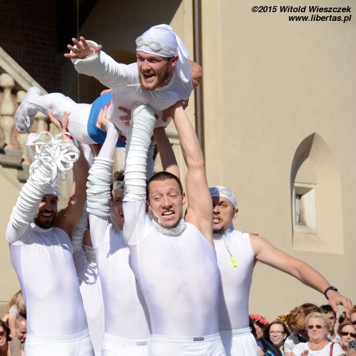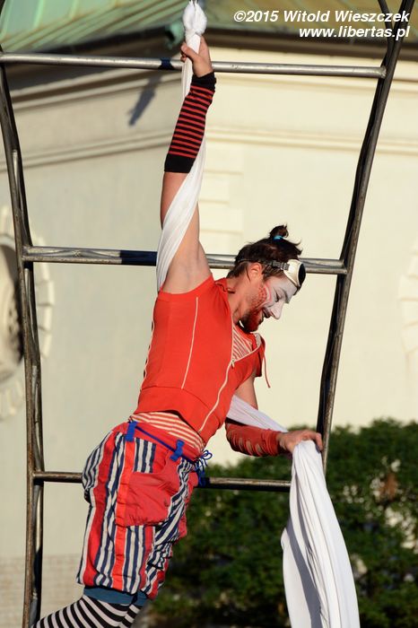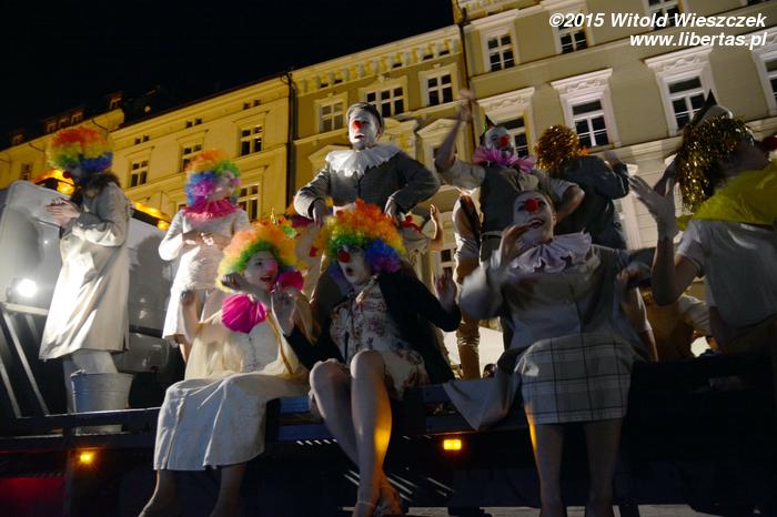 Podobnie jak w poprzednich latach, nie obeszło się też bez uroczystej parady artystów, która okrążyła Rynek przy dźwiękach muzyki i w świetle wybuchających fajerwerków. Ubiegłoroczna podobała mi się bardziej, była bardziej kolorowa i różnorodna. Ale moje dzieci nie narzekały, zwłaszcza że, zgodnie z dewizą tegorocznego festiwalu, zdecydowanie dominowały roześmiane twarze klaunów. Parada zakończyła się tańcem na ratuszowej wieży w wykonaniu zespołu Delreves, który gościł na festiwalu w Krakowie 5 lat temu. Tym razem oczywiście artyści wystąpili w strojach... klaunów. Nie mogło być inaczej.