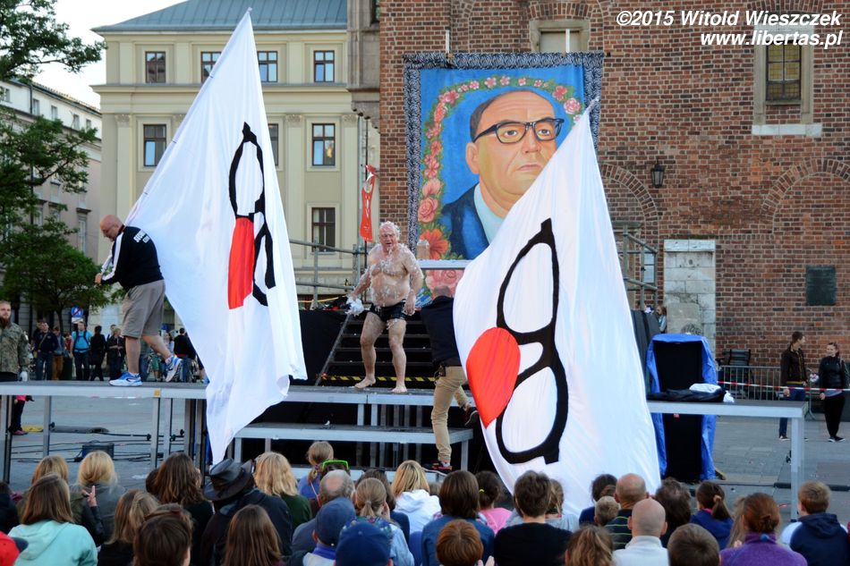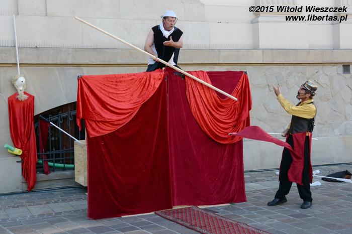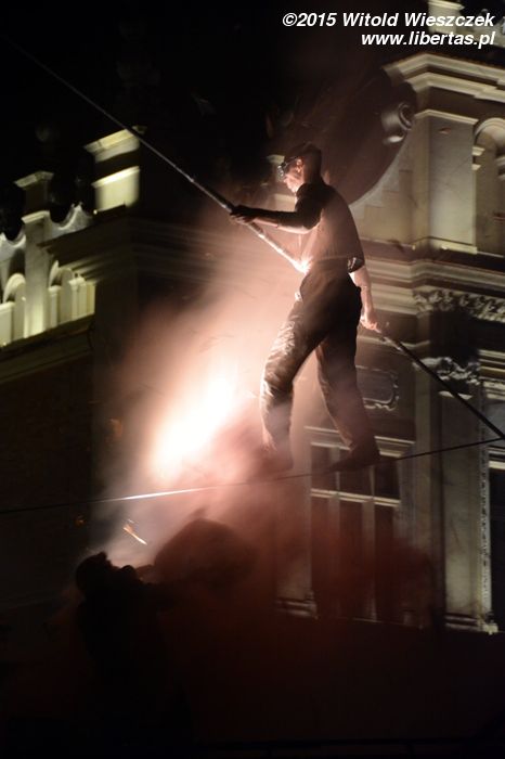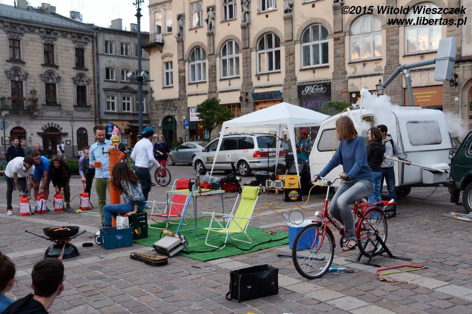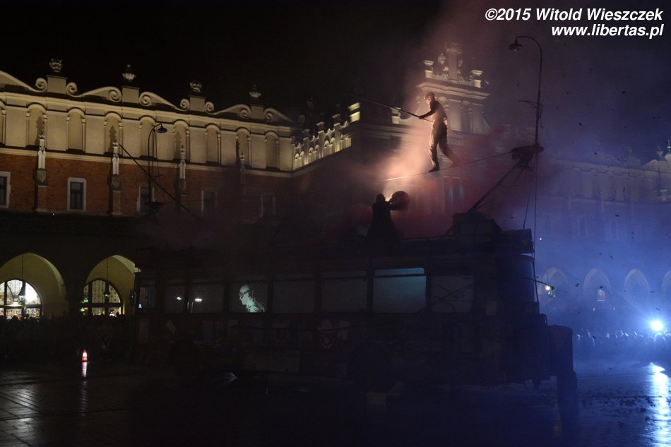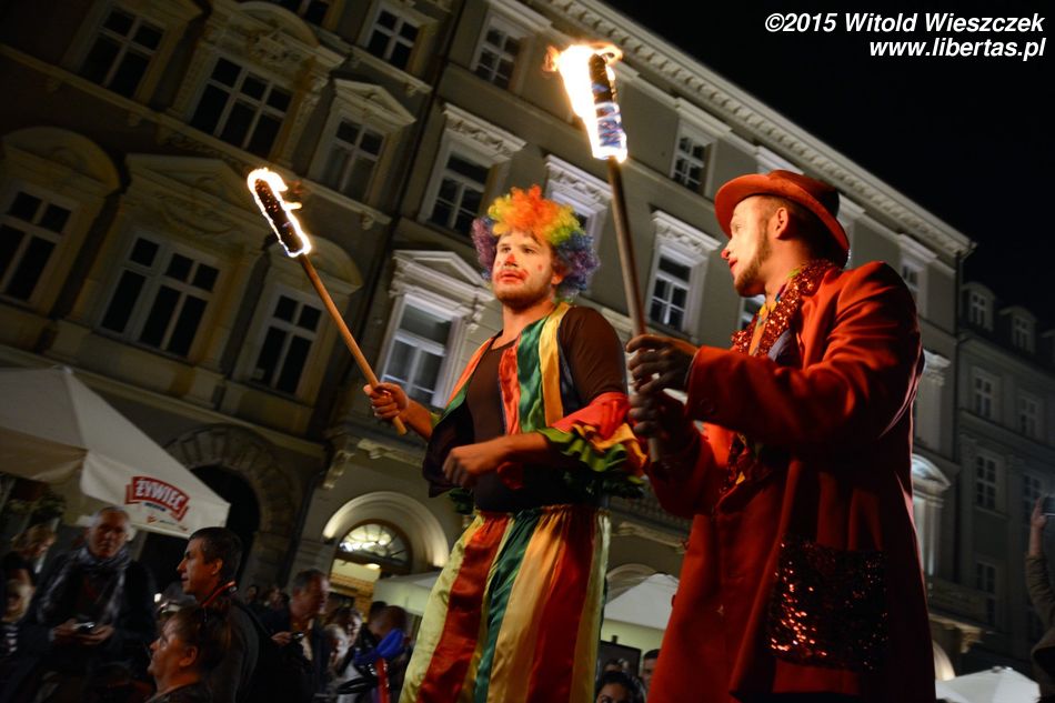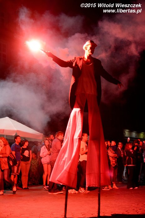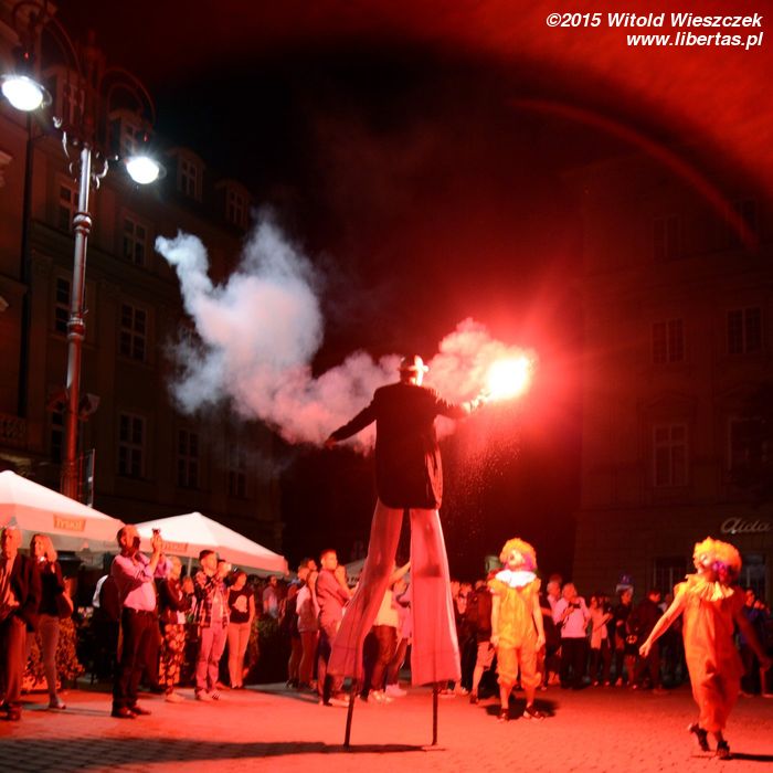 Do tego naprawdę denerwujące jest, gdy przedstawienie, na które czeka mały tłum (w tym często dzieci), jest bez żadnego sensownego powodu i choćby słowa wytłumaczenia tak opóźnione. Rozumiem, że wehikuł musiał dojechać z Placu Szczepańskiego, ale to chyba powinien wyruszyć odpowiednio wcześniej. Co innego sytuacje losowe (za które również wypadałoby przeprosić, że nie wspomnę o odpowiedniej informacji), ale każdy inny powód to po prostu brak szacunku dla widzów. I podobnie myślała chyba Amerykanka stojąca obok mnie, która kilka razy głośno swoje niezadowolenie wyrażała, a potem inicjowała ponaglające brawa, które miały uświadomić organizatorom, że chyba tak być nie powinno. Nie wiem, może finał wszystkim długie oczekiwanie wynagrodził, ja (i widziałem, że nie tylko ja) o tak późnej godzinie tyle cierpliwości nie miałem.