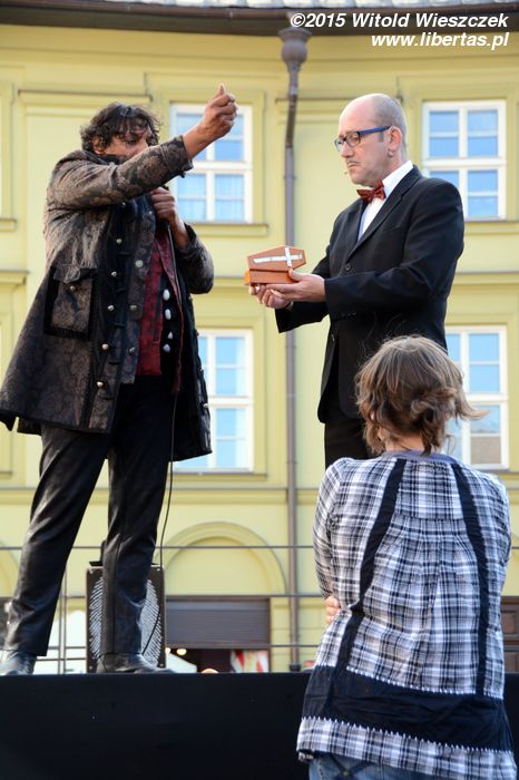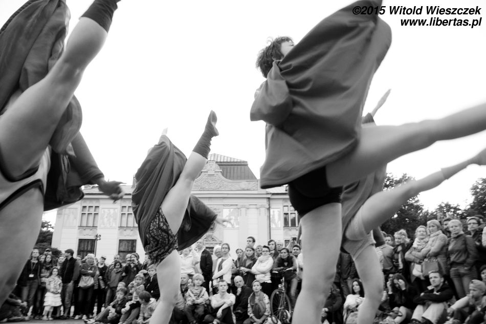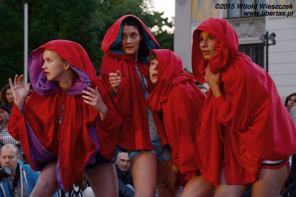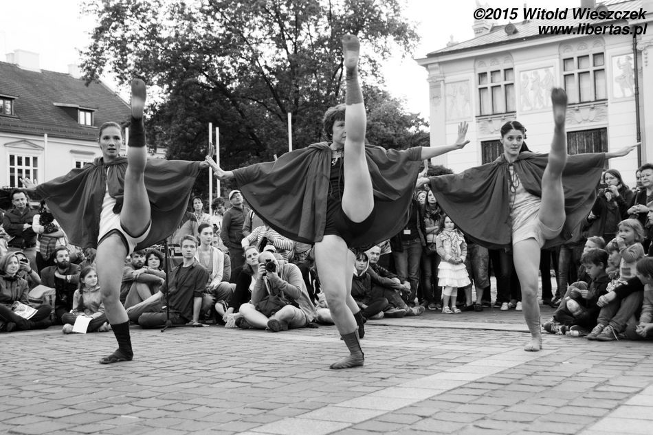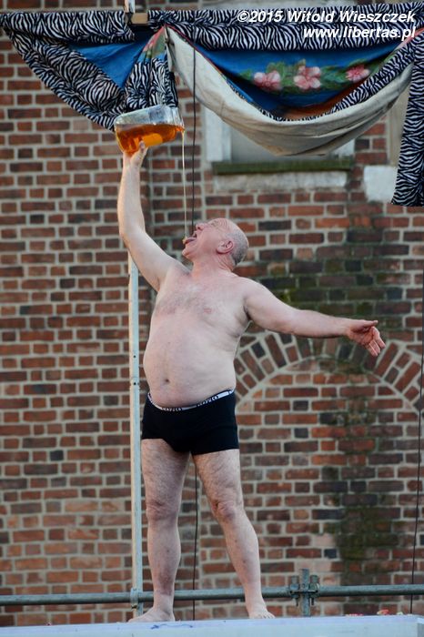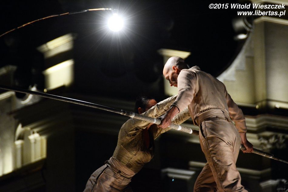 Do tego spektaklu mieliśmy dwa podejścia. Pierwszego dnia rozpadał się deszcz. Publiczność była twarda i trwała na swoich miejscach mimo przeciwności losu – wszak niegrzecznie byłoby w środku nieźle zapowiadającego się przedstawienia z tak błahego powodu wychodzić. Artyści ulitowali się jednak i, żeby nikomu nie było szkoda, swój występ przerwali. Cóż, taki urok występów pod chmurką.