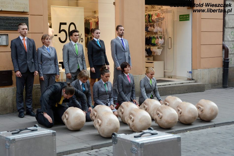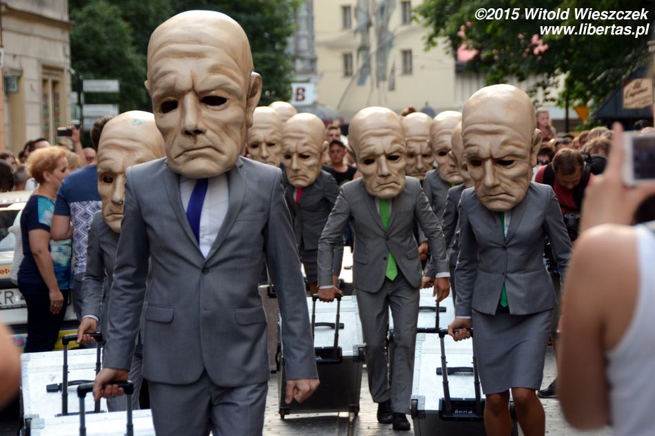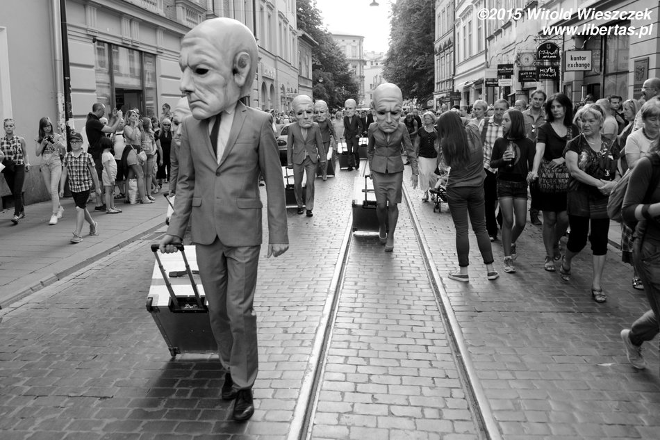 Organizator zaprezentował na festiwalu dwa przedstawienia. Monumentalnych Ślepców, których można było zobaczyć również w poprzednich latach i wędrującego po rynku Peregrinusa. Peregrinus rano jeszcze się uśmiecha, ale potem wkłada garnitur i maskę, po czym pędzi do pracy w jakiejś bezimiennej korporacji. Je w jakimś fast-foodzie, atrapę świąt obchodzi na firmowej uroczystości. Przykra jest trochę ta wizja naszej XXI-wiecznej nie-rzeczywistości. Korporacje, makdonaldy, ciągły bieg, żeby nie powiedzieć pozbawiona celu tułaczka z jedną walizką.