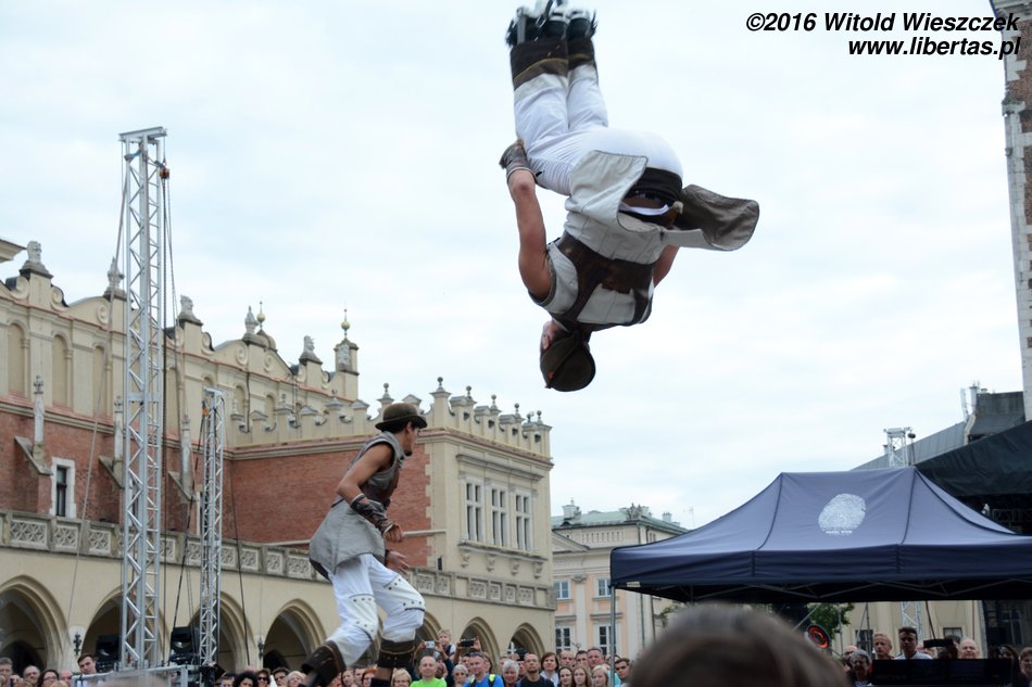 Zespół Duchamp Pilot zapewnił swojemu koncertowi bardzo oryginalną oprawę... Właściwie co roku możemy na krakowskim rynku obejrzeć takie podniebne przedstawienia... Bywali już tancerze, którzy przybierając pozycje horyzontalne, przenosili podłogę na ściany Ratusza, bywały dźwigi i zawieszone nad głowami karuzele, a towarzyszyła temu skromniejsza lub bogatsza oprawa muzyczna... Można powiedzieć, że nic nowego, po prostu kolejna odsłona tego samego pomysłu, choć rozmach jednak jakby trochę większy. Może i nic odkrywczego, ale przyjemnie popatrzyć, a skoro zespół musiał bisować, to znaczy, że się podobało...