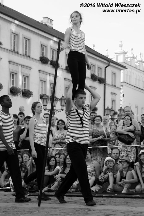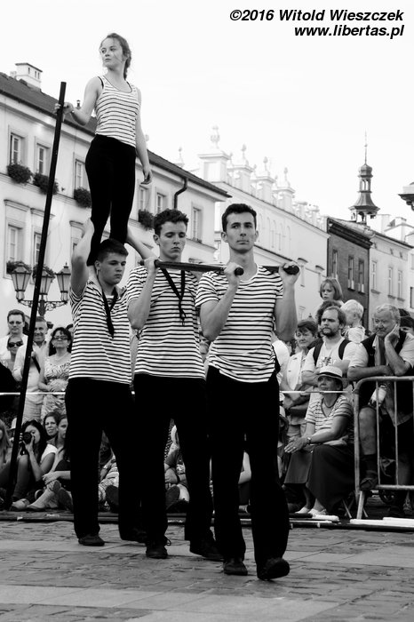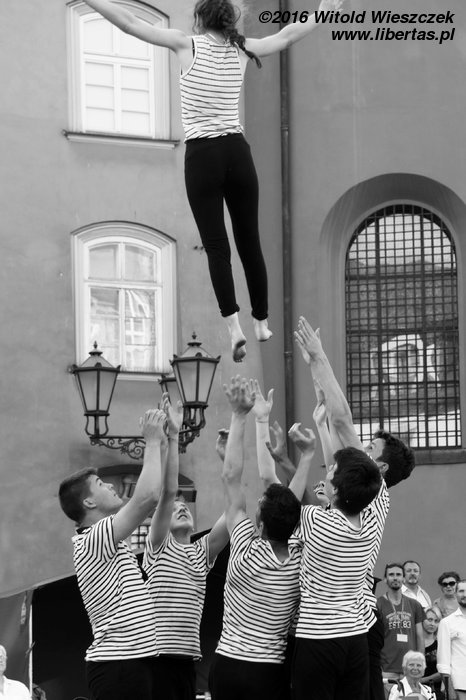 Zupełnie niepozorna zapowiedź... Żonglerka, akrobacja, humor, muzyka na żywo... Właściwie nic nowego, nic świeżego... Oprócz artystów! Spektakl bardzo miło mnie zaskoczył, a jego siłę widzę właśnie w młodości, energii i radości, z jaką podeszli do swojej „pracy” młodzi (momentami miałem wrażenie, że niepełnoletni!) cyrkowcy. Może dlatego zdarzyło im się kilka niedociągnięć, ale one nie mają żadnego znaczenia! Prosta fabuła oczywiście była tylko pretekstem do pokazania cyrkowych umiejętności młodych adeptów tej sztuki, a jednak całość smakowała zdecydowanie lepiej, niż większość festiwalowych wydarzeń kreowanych często przez bardziej doświadczonych kolegów! Na długo zapamiętam przenoszoną, a potem wręcz tańczącą (i grającą!) perkusję, że nie wspomnę o pięknej pannie, którą mężczyźni noszą na rękach i podrzucają do nieba, królową ich serc schodzącą do nas ze swojego powietrznego królestwa po schodach tworzonych z rąk adoratorów... Pomyśleć, że o mały włos mogłem tego nie zobaczyć! Wiem, wiem, nic takiego, każdy akrobata tak potrafi... Tylko może nie każdy jeszcze potrafi czerpać z tego radość i zarażać nią publiczność? Bardzo bym chciał ich w Krakowie zobaczyć za rok!